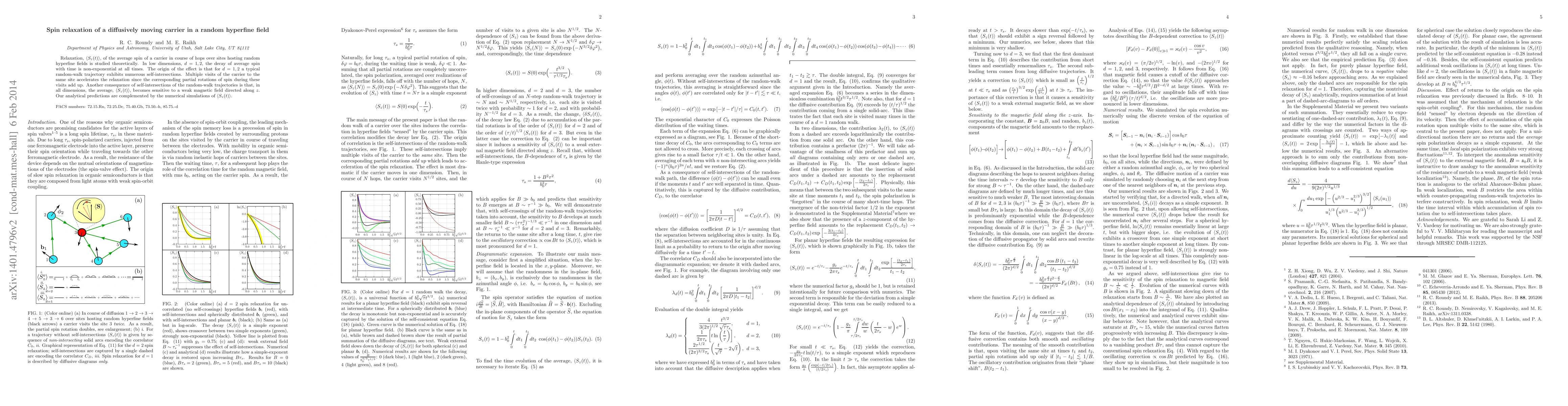 This paper theoretically investigates the spin relaxation of a diffusively moving carrier in a random hyperfine field, finding non-exponential decay in low dimensions due to self-intersections in random-walk trajectories. The study also reveals sensitivity of the average spin to a weak magnetic field along the z-axis, supported by analytical predictions and numerical simulations.