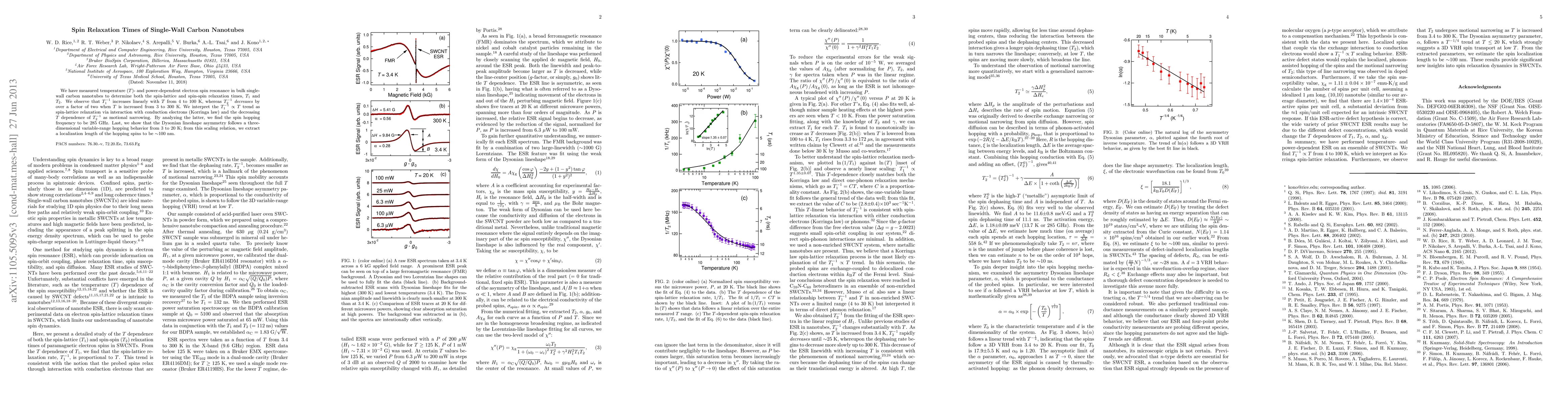 This study measures temperature- and power-dependent electron spin resonance in single-wall carbon nanotubes, finding that spin-lattice relaxation ($T_1$) follows a linear increase with temperature, while spin-spin relaxation ($T_2$) decreases significantly, indicating motional narrowing and a spin hopping frequency of 285 GHz.