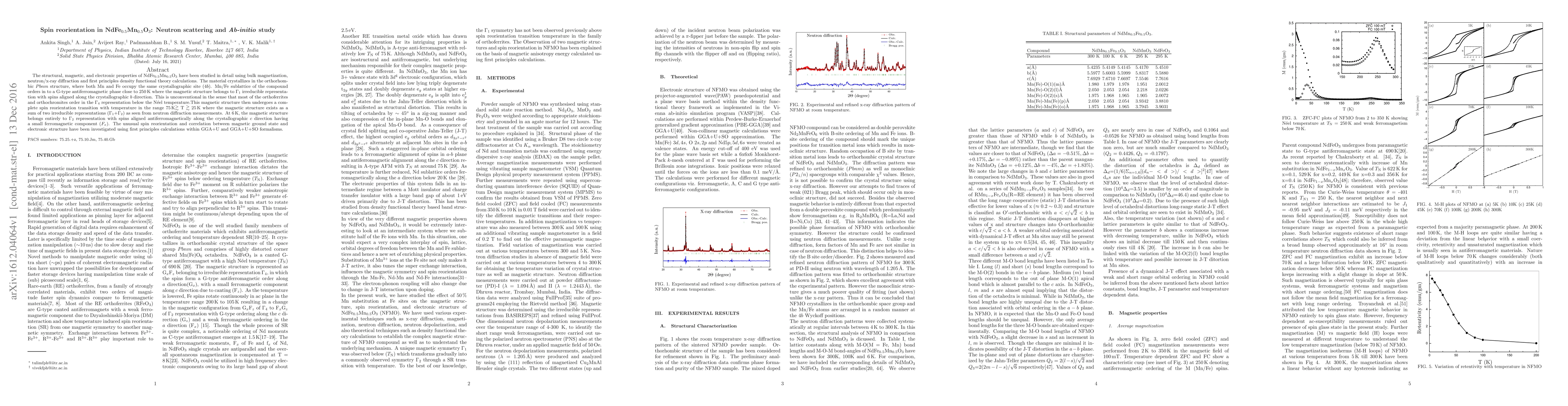 The structural, magnetic, and electronic properties of NdFe$_{0.5}$Mn$_{0.5}$O$_3$ have been studied in detail using bulk magnetization, neutron/x-ray diffraction and first principles density functional theory calculations. The material crystallizes in the orthorhombic $Pbnm$ structure, where both Mn and Fe occupy the same crystallographic site ($4b$). Mn/Fe sublattice of the compound orders in to a G-type antiferromagnetic phase close to 250\,K where the magnetic structure belongs to ${\Gamma}_{1}$ irreducible representation with spins aligned along the crystallographic $b$ direction. This is unconventional in the sense that most of the orthoferrites and orthochromites order in the ${\Gamma}_{4}$ representation below the N\'{e}el temperature.This magnetic structure then undergoes a complete spin reorientation transition with temperature in the range 75\,K$\gtrsim$ T $\gtrsim$ 25\,K where the magnetic structure exists as a sum of two irreducible representations (${\Gamma}_{1}$+${\Gamma}_{2}$) as seen from neutron diffraction measurements. At 6\,K, the magnetic structure belongs entirely to ${\Gamma}_{2}$ representation with spins aligned antiferromagnetically along the crystallographic $c$ direction having a small ferromagnetic component ($F_x$). The unusual spin reorientation and correlation between magnetic ground state and electronic structure have been investigated using first principles calculations within GGA+U and GGA+U+SO formalisms.