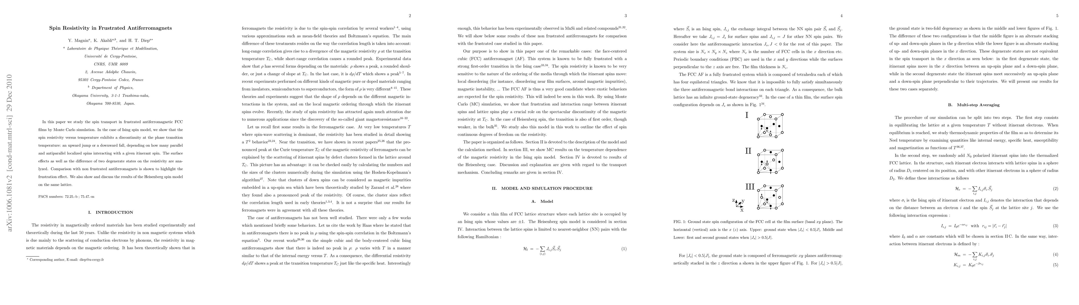 This paper investigates spin transport in frustrated antiferromagnetic FCC films using Monte Carlo simulations, revealing a discontinuity in spin resistivity at the phase transition temperature, with the change direction depending on spin interactions. It also analyzes surface effects and compares results with non-frustrated antiferromagnets to highlight the frustration effect.