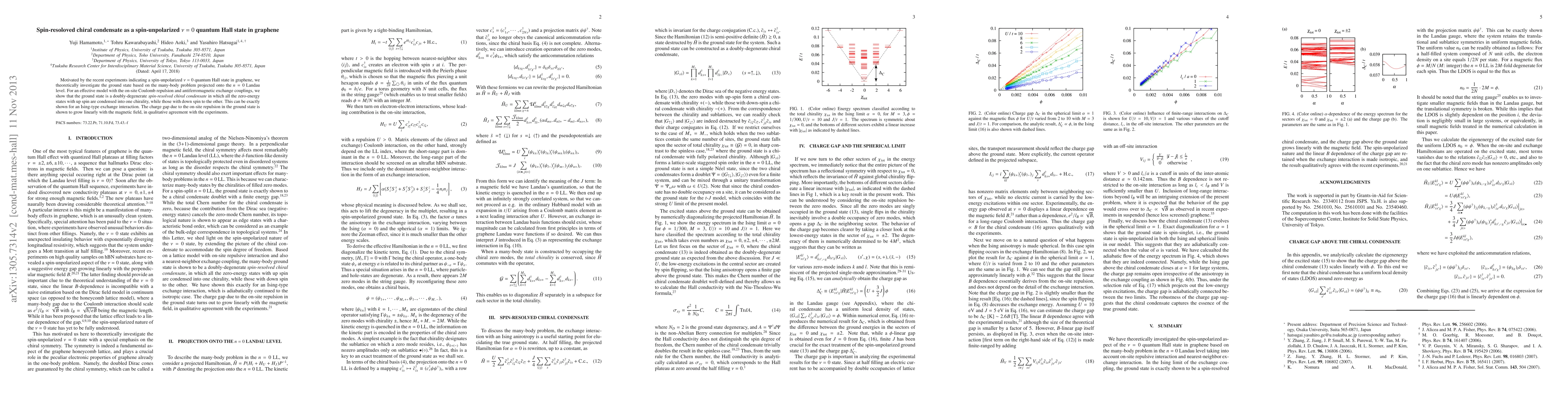This paper investigates the ground state of graphene's spin-unpolarized ν=0 quantum Hall state, revealing a doubly-degenerate spin-resolved chiral condensate where zero-energy states are split by spin chirality. The charge gap grows linearly with magnetic field, aligning with experimental observations.