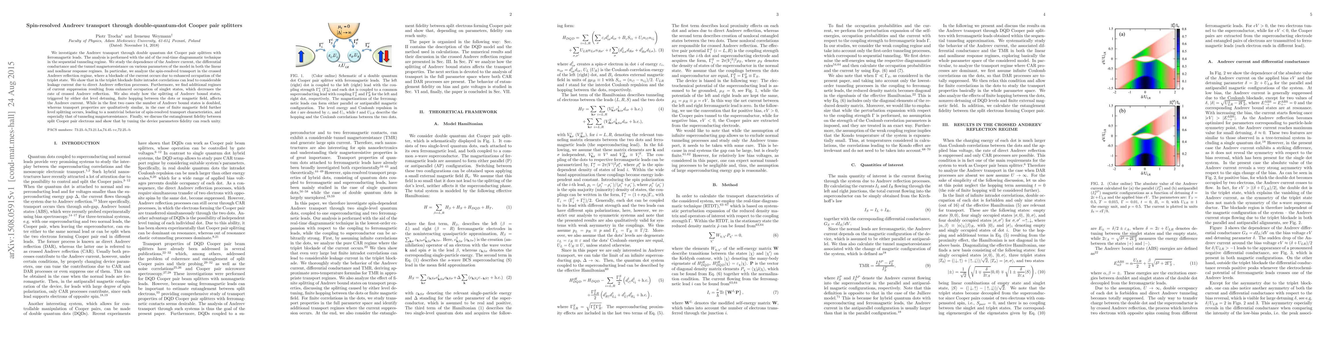 This paper investigates spin-resolved Andreev transport in double-quantum-dot Cooper pair splitters with ferromagnetic leads, revealing regimes of current suppression and leakage due to triplet and singlet states. It also explores the effects of dot level detuning, hopping, and magnetic fields on Andreev bound states and tunneling magnetoresistance, concluding that fidelity can reach unity with proper parameter tuning.