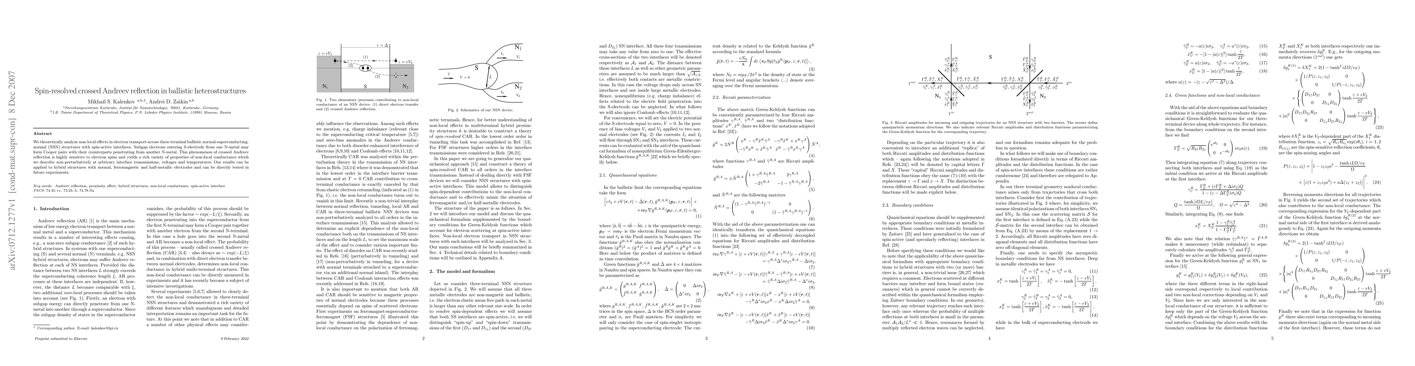 The paper explores non-local effects in electron transport through three-terminal ballistic NSN structures with spin-active interfaces, focusing on the spin-sensitive crossed Andreev reflection phenomenon that can lead to diverse non-local conductance properties. The theoretical analysis is non-perturbative and applicable to various hybrid structures, providing a foundation for future experimental validation.