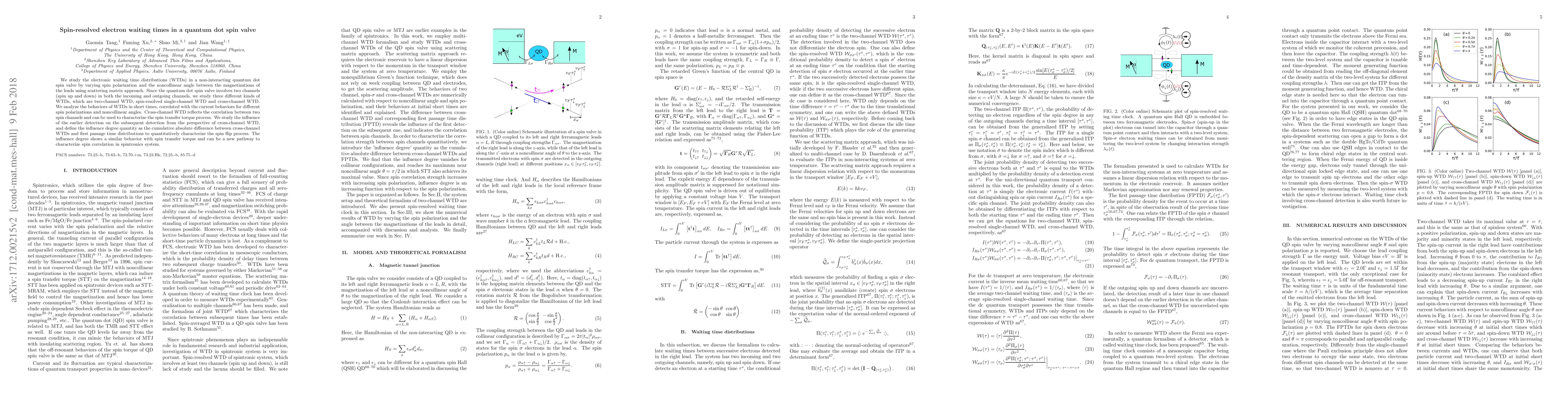 This paper investigates spin-resolved waiting time distributions in a quantum dot spin valve, analyzing the effects of spin polarization and noncollinear magnetization angles. The study introduces a new measure, the influence degree, to quantify spin flip processes and characterize spin correlation in spintronics.