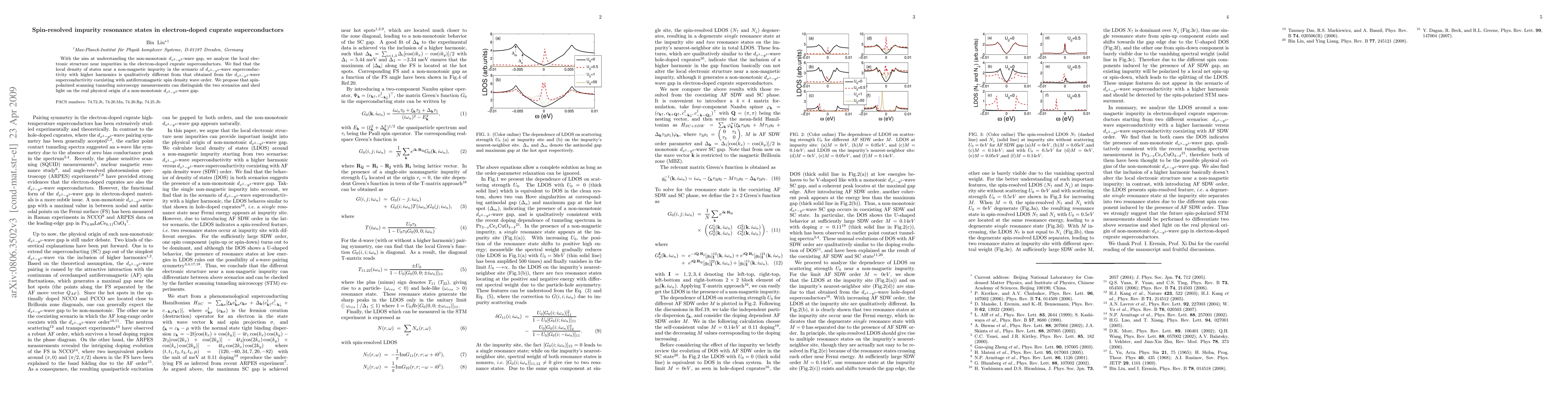 This paper investigates the local electronic structure near impurities in electron-doped cuprate superconductors, finding distinct spin-resolved impurity resonance states in $d_{x^{2}-y^{2}}$-wave superconductivity with higher harmonics compared to coexistence with antiferromagnetic spin density wave order. The study suggests that spin-polarized scanning tunneling microscopy can differentiate these scenarios, aiding in understanding the non-monotonic $d_{x^{2}-y^{2}}$-wave gap.