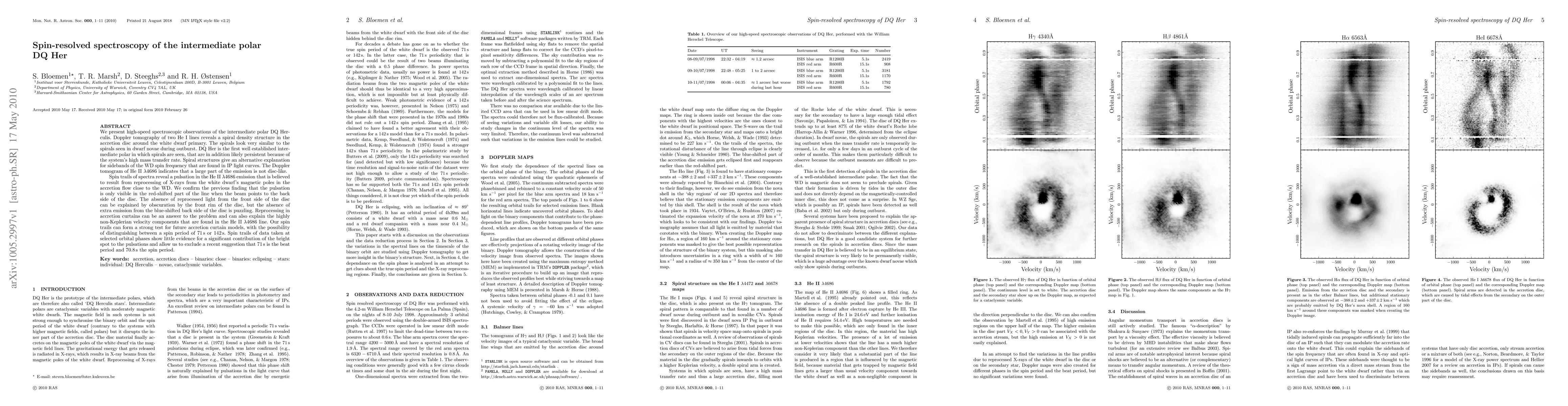 We present high-speed spectroscopic observations of the intermediate polar DQ Herculis. Doppler tomography of two He I lines reveals a spiral density structure in the accretion disc around the white dwarf primary. The spirals look very similar to the spirals seen in dwarf novae during outburst. DQ Her is the first well established intermediate polar in which spirals are seen, that are in addition likely persistent because of the system's high mass transfer rate. Spiral structures give an alternative explanation for sidebands of the WD spin frequency that are found in IP light curves. The Doppler tomogram of He II 4686 indicates that a large part of the emission is not disc-like. Spin trails of spectra reveal a pulsation in the He II 4686 emission that is believed to result from reprocessing of X-rays from the white dwarf's magnetic poles in the accretion flow close to the WD. We confirm the previous finding that the pulsation is only visible in the red-shifted part of the line when the beam points to the back side of the disc. The absence of reprocessed light from the front side of the disc can be explained by obscuration by the front rim of the disc, but the absence of extra emission from the blue-shifted back side of the disc is puzzling. Reprocessing in accretion curtains can be an answer to the problem and can also explain the highly non-Keplerian velocity components that are found in the He II 4686 line. Our spin trails can form a strong test for future accretion curtain models, with the possibility of distinguishing between a spin period of 71s or 142s. Spin trails of data taken at selected orbital phases show little evidence for a significant contribution of the bright spot to the pulsations and allow us to exclude a recent suggestion that 71s is the beat period and 70.8s the spin period.