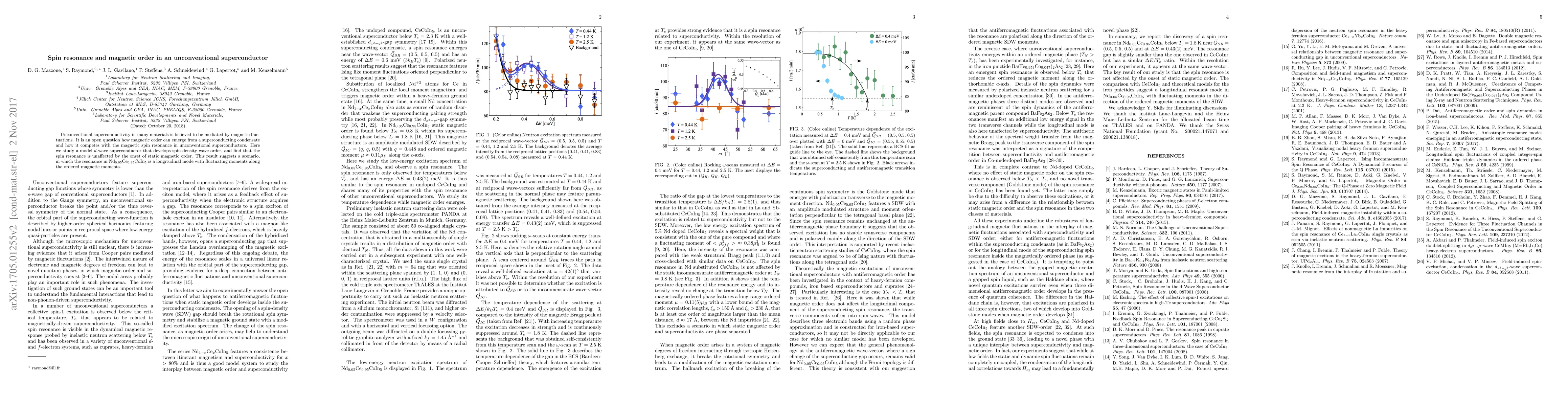 Unconventional superconductivity in many materials is believed to be mediated by magnetic fluctuations. It is an open question how magnetic order can emerge from a superconducting condensate and how it competes with the magnetic spin resonance in unconventional superconductors. Here we study a model d-wave superconductor that develops spin-density wave order, and find that the spin resonance is unaffected by the onset of static magnetic order. This result suggests a scenario, in which the resonance in Nd0.05Ce0.95CoIn5 is a longitudinal mode with fluctuating moments along the ordered magnetic moments.
