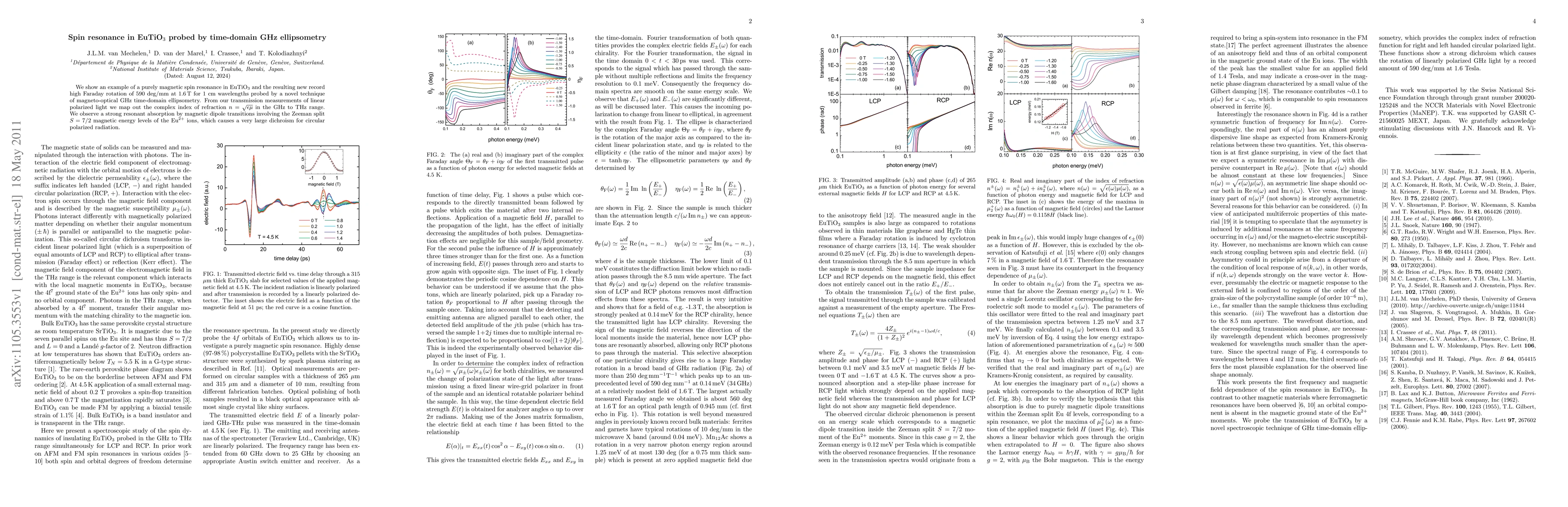 We show an example of a purely magnetic spin resonance in EuTiO3 and the resulting new record high Faraday rotation of 590 deg/mm at 1.6 T for 1 cm wavelengths probed by a novel technique of magneto-optical GHz time-domain ellipsometry. From our transmission measurements of linear polarized light we map out the complex index of refraction in the GHz to THz range. We observe a strong resonant absorption by magnetic dipole transitions involving the Zeeman split S=7/2 magnetic energy levels of the Eu 2+ ions, which causes a very large dichroism for circular polarized radiation.