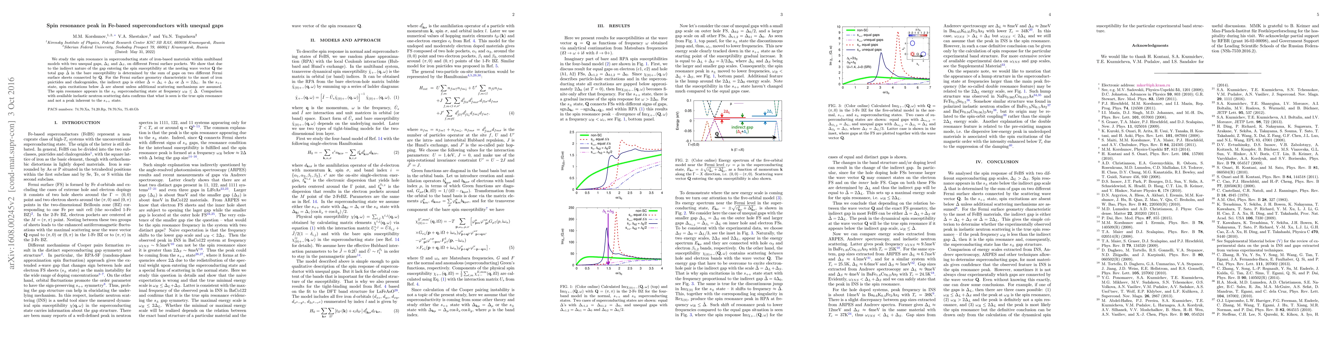 We study the spin resonance in superconducting state of iron-based materials within multiband models with two unequal gaps, $\Delta_L$ and $\Delta_S$, on different Fermi surface pockets. We show that due to the indirect nature of the gap entering the spin susceptibility at the nesting wave vector $\mathbf{Q}$ the total gap $\tilde\Delta$ in the bare susceptibility is determined by the sum of gaps on two different Fermi surface sheets connected by $\mathbf{Q}$. For the Fermi surface geometry characteristic to the most of iron pnictides and chalcogenides, the indirect gap is either $\tilde\Delta = \Delta_L + \Delta_S$ or $\tilde\Delta = 2\Delta_L$. In the $s_{++}$ state, spin excitations below $\tilde\Delta$ are absent unless additional scattering mechanisms are assumed. The spin resonance appears in the $s_\pm$ superconducting state at frequency $\omega_R \leq \tilde\Delta$. Comparison with available inelastic neutron scattering data confirms that what is seen is the true spin resonance and not a peak inherent to the $s_{++}$ state.