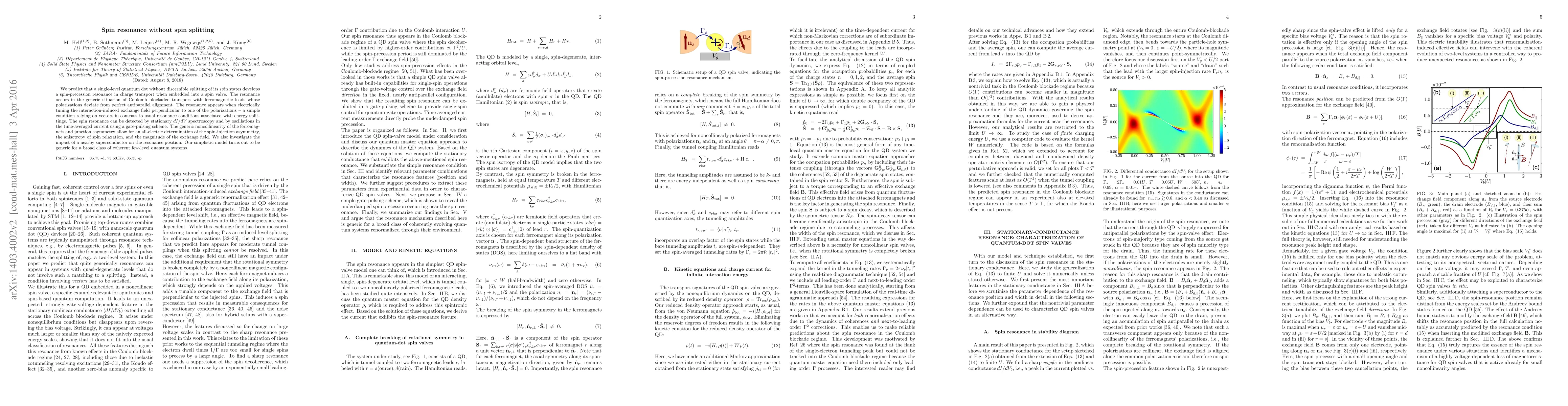We predict that a single-level quantum dot without discernible splitting of its spin states develops a spin-precession resonance in charge transport when embedded into a spin valve. The resonance occurs in the generic situation of Coulomb blockaded transport with ferromagnetic leads whose polarizations deviate from perfect antiparallel alignment. The resonance appears when electrically tuning the interaction-induced exchange field perpendicular to one of the polarizations -- a simple condition relying on vectors in contrast to usual resonance conditions associated with energy splittings. The spin resonance can be detected by stationary dI/dV spectroscopy and by oscillations in the time-averaged current using a gate-pulsing scheme. The generic noncollinearity of the ferromagnets and junction asymmetry allow for an all-electric determination of the spin-injection asymmetry, the anisotropy of spin relaxation, and the magnitude of the exchange field. We also investigate the impact of a nearby superconductor on the resonance position. Our simplistic model turns out to be generic for a broad class of coherent few-level quantum systems.