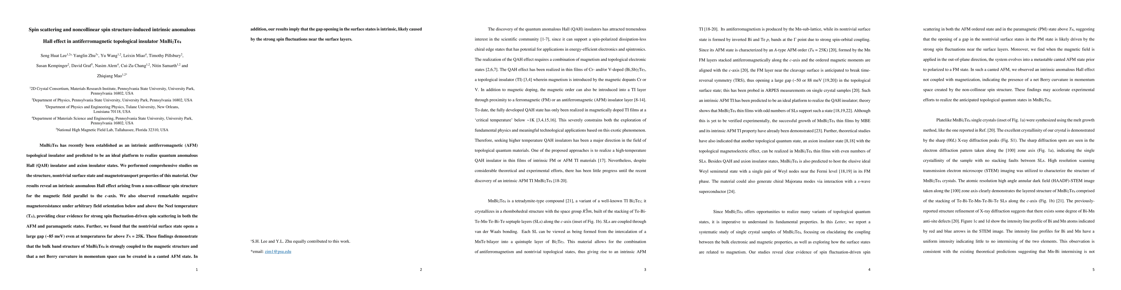 $\mathrm{MnBi_2Te_4}$ has recently been established as an intrinsic antiferromagnetic (AFM) topological insulator and predicted to be an ideal platform to realize quantum anomalous Hall (QAH) insulator and axion insulator states. We performed comprehensive studies on the structure, nontrivial surface state and magnetotransport properties of this material. Our results reveal an intrinsic anomalous Hall effect arising from a non-collinear spin structure for the magnetic field parallel to the $c$-axis. We also observed remarkable negative magnetoresistance under arbitrary field orientation below and above the Neel temperature (T$_N$), providing clear evidence for strong spin fluctuation-driven spin scattering in both the AFM and paramagnetic states. Further, we found that the nontrivial surface state opens a large gap (~85 meV) even at temperatures far above T$_N$ = 25K. These findings demonstrate that the bulk band structure of $\mathrm{MnBi_2Te_4}$ is strongly coupled to the magnetic structure and that a net Berry curvature in momentum space can be created in a canted AFM state. In addition, our results imply that the gap opening in the surface states is intrinsic, likely caused by the strong spin fluctuations near the surface layers.