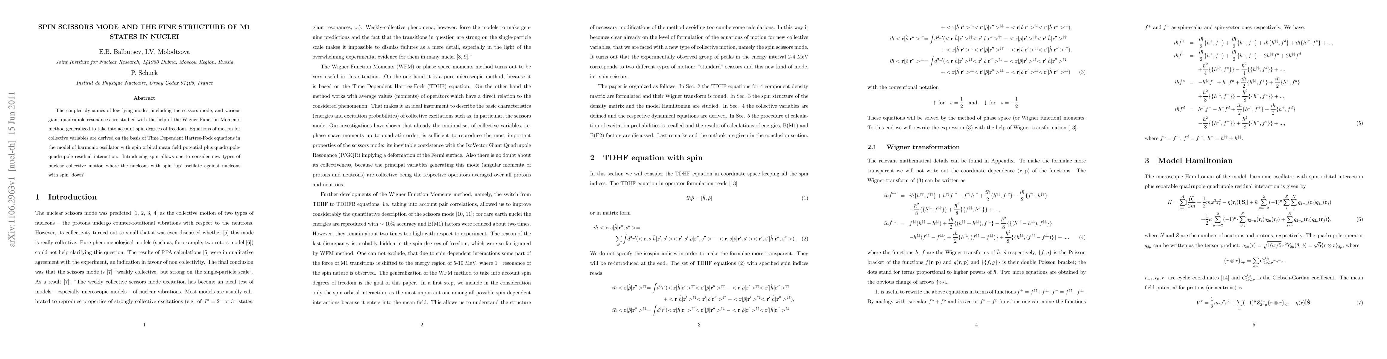 This paper investigates the dynamics of low-lying nuclear modes, including the scissors mode and giant quadrupole resonances, using a generalized Wigner Function Moments method that incorporates spin degrees of freedom. It derives equations of motion based on Time Dependent Hartree-Fock equations, revealing new types of collective nuclear motion where spin 'up' and 'down' nucleons oscillate against each other.