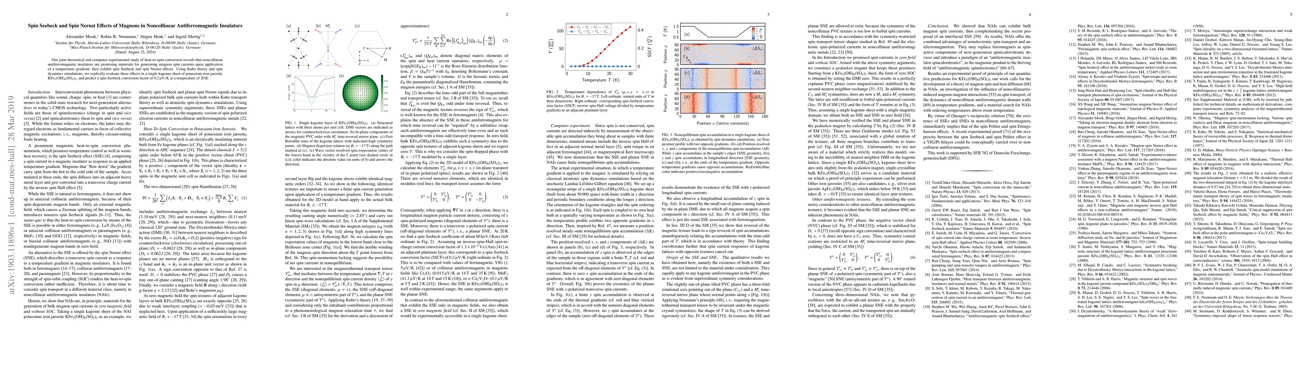 This study combines theoretical and computational methods to demonstrate that noncollinear antiferromagnetic insulators, specifically a kagome sheet of potassium iron jarosite, can generate magnon spin currents via spin Seebeck and spin Nernst effects when subjected to a temperature gradient. The predicted spin Seebeck conversion factor is $0.2 \mu\mathrm{V}/\mathrm{K}$ at $20 \mathrm{K}$.