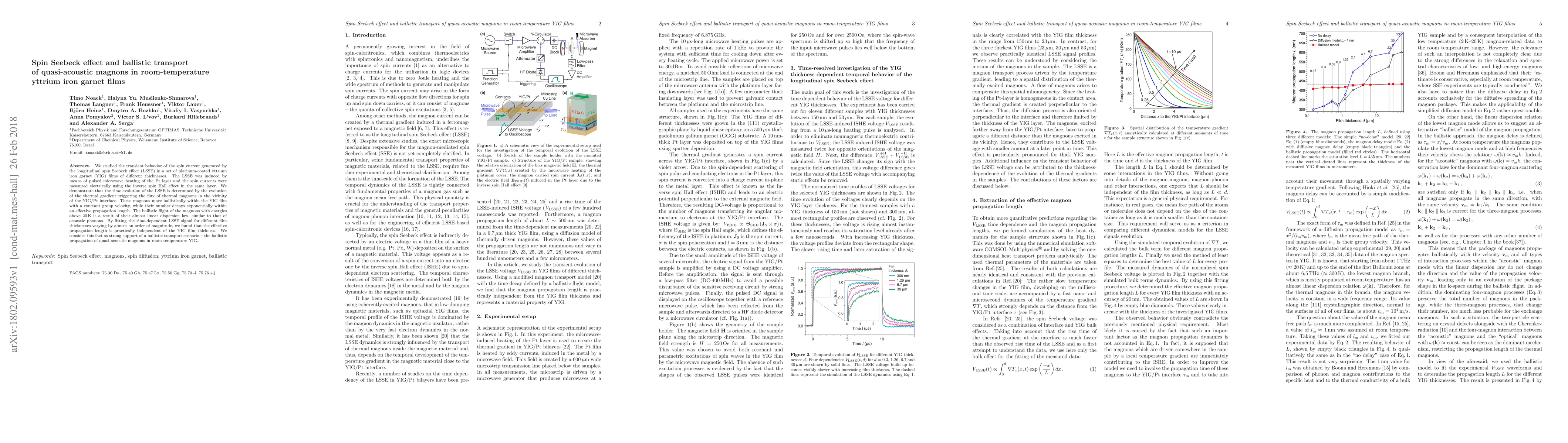 This paper investigates the transient spin current from the longitudinal spin Seebeck effect in platinum-coated yttrium iron garnet films, revealing ballistic transport of quasi-acoustic magnons with a constant group velocity and an effective propagation length independent of film thickness. The magnons' linear dispersion and constant velocity support a ballistic transport model in room-temperature YIG.