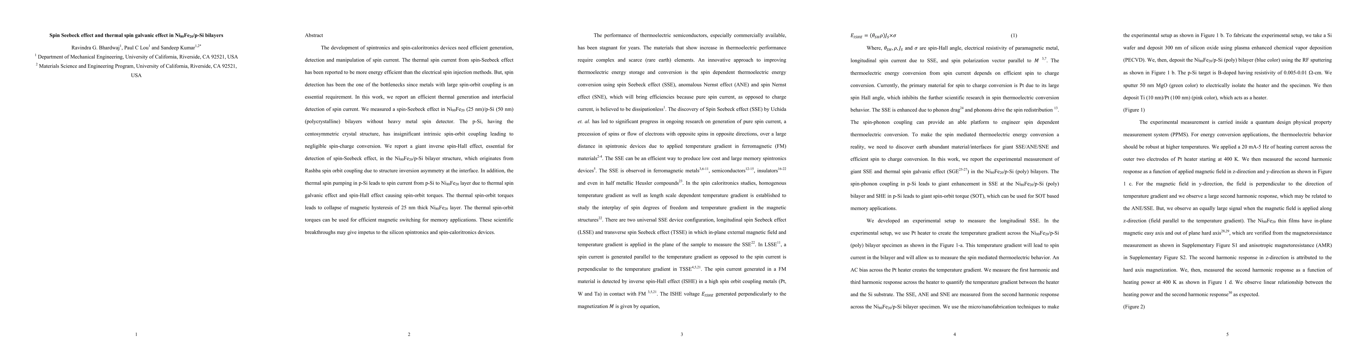 This paper reports the efficient thermal generation and detection of spin current in Ni80Fe20/p-Si bilayers without heavy metal spin detectors, demonstrating a giant inverse spin-Hall effect and thermal spin galvanic effect, which could advance silicon spintronics and spin-caloritronics devices. The findings suggest potential for magnetic switching in memory applications through thermal spin-orbit torques.