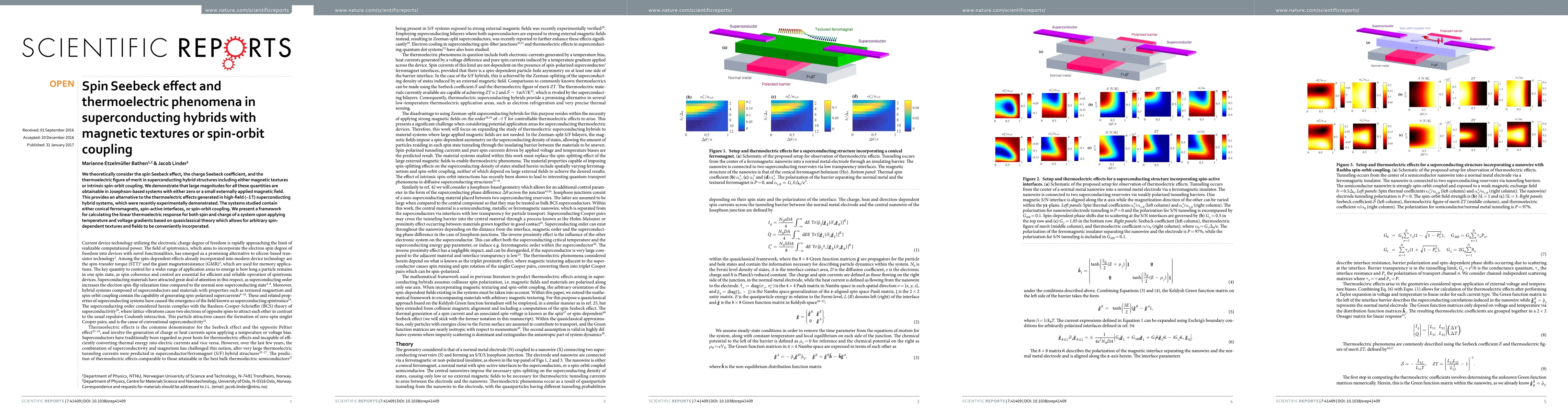 This paper theoretically explores the spin Seebeck effect, charge Seebeck coefficient, and thermoelectric figure of merit in superconducting hybrid systems with magnetic textures or spin-orbit coupling, demonstrating significant effects even with minimal external magnetic fields. The study provides a framework for calculating linear thermoelectric responses based on quasiclassical theory.