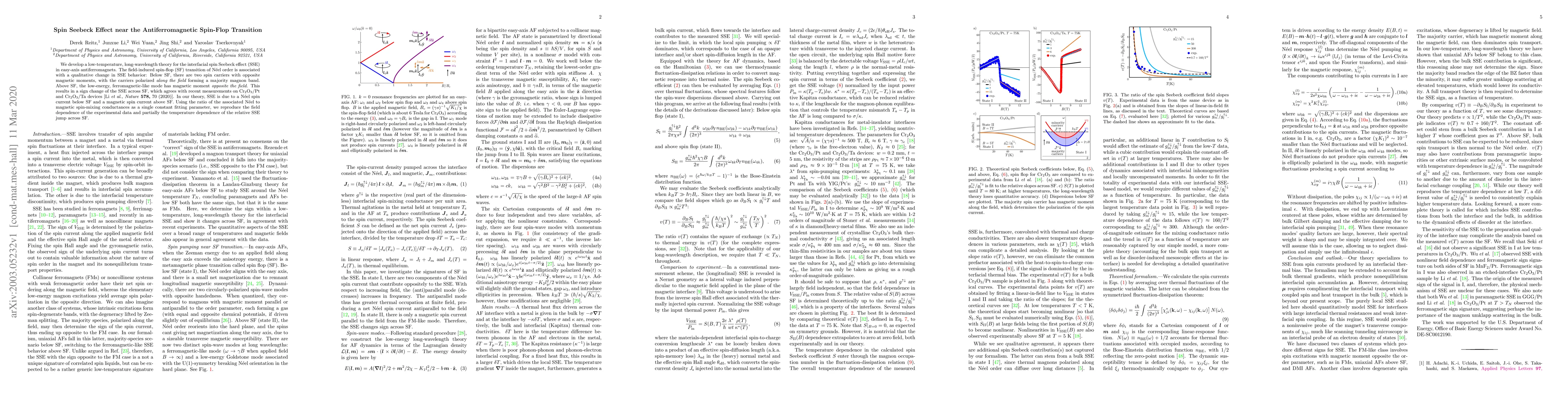 We develop a low-temperature, long-wavelength theory for the interfacial spin Seebeck effect (SSE) in easy-axis antiferromagnets. The field-induced spin-flop (SF) transition of N\'eel order is associated with a qualitative change in SSE behavior: Below SF, there are two spin carriers with opposite magnetic moments, with the carriers polarized along the field forming a majority magnon band. Above SF, the low-energy, ferromagnetic-like mode has magnetic moment opposite the field. This results in a sign change of the SSE across SF, which agrees with recent measurements on Cr$_2$O$_3$/Pt and Cr$_2$O$_3$/Ta devices [Li $\textit{et al.,}$ $\textit{Nature}$ $\textbf{578,}$ 70 (2020)]. In our theory, SSE is due to a N\'eel spin current below SF and a magnetic spin current above SF. Using the ratio of the associated N\'eel to magnetic spin-mixing conductances as a single constant fitting parameter, we reproduce the field dependence of the experimental data and partially the temperature dependence of the relative SSE jump across SF.