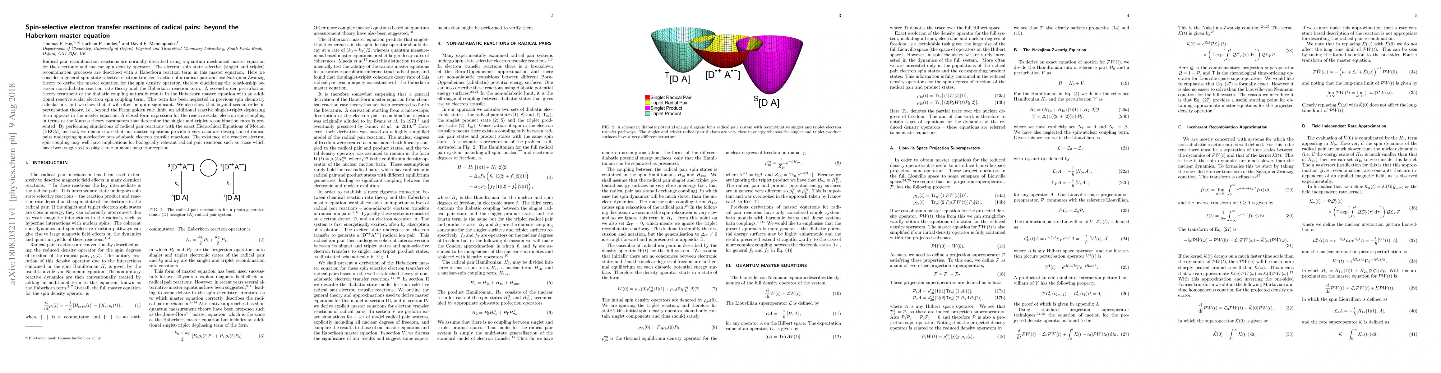 This research develops a refined master equation for spin-selective electron transfer in radical pairs using Nakajima-Zwanzig theory, revealing significant reactive scalar electron spin coupling and additional dephasing terms beyond the Haberkorn equation. Simulations show these improvements accurately describe radical pair dynamics, with potential implications for biological processes like avian magnetoreception.