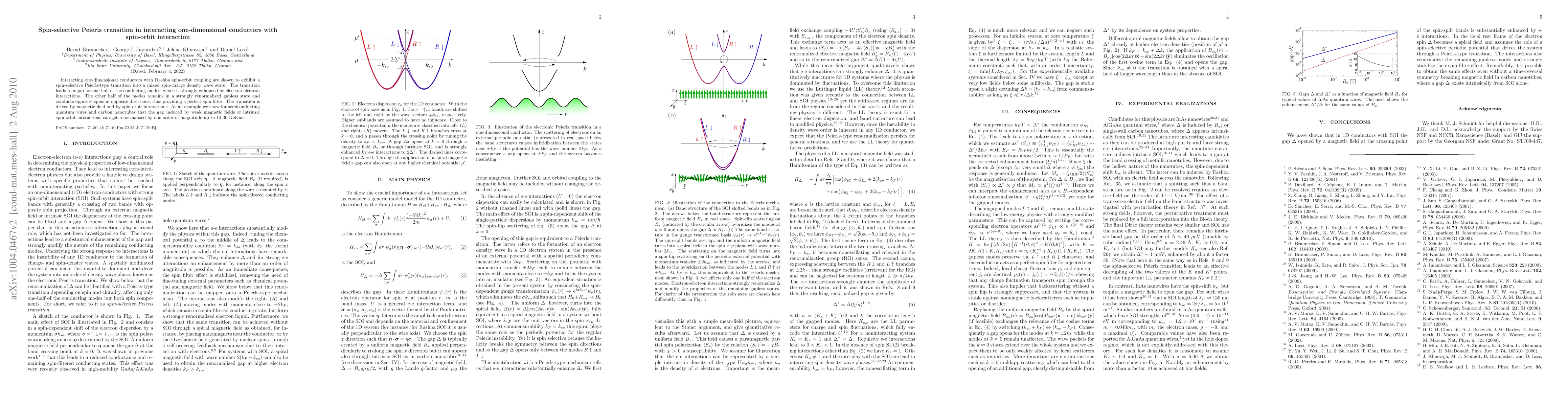 Interacting one-dimensional conductors with Rashba spin-orbit coupling are shown to exhibit a spin-selective Peierls-type transition into a mixed spin-charge-density-wave state. The transition leads to a gap for one-half of the conducting modes, which is strongly enhanced by electron-electron interactions. The other half of the modes remains in a strongly renormalized gapless state and conducts opposite spins in opposite directions, thus providing a perfect spin filter. The transition is driven by magnetic field and by spin-orbit interactions. As an example we show for semiconducting quantum wires and carbon nanotubes that the gap induced by weak magnetic fields or intrinsic spin-orbit interactions can get renormalized by 1 order of magnitude up to 10 - 30 K.