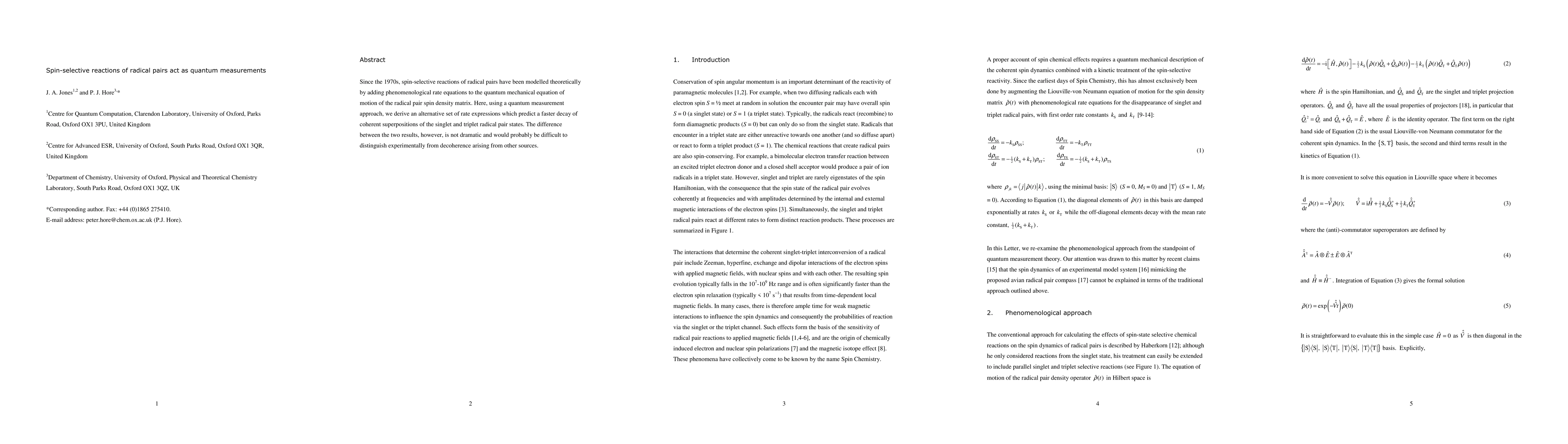 This paper proposes a quantum measurement approach to model spin-selective reactions of radical pairs, deriving rate expressions that predict a faster decay of coherent superpositions compared to traditional methods. The predicted difference remains subtle, likely indistinguishable from decoherence effects in experiments.