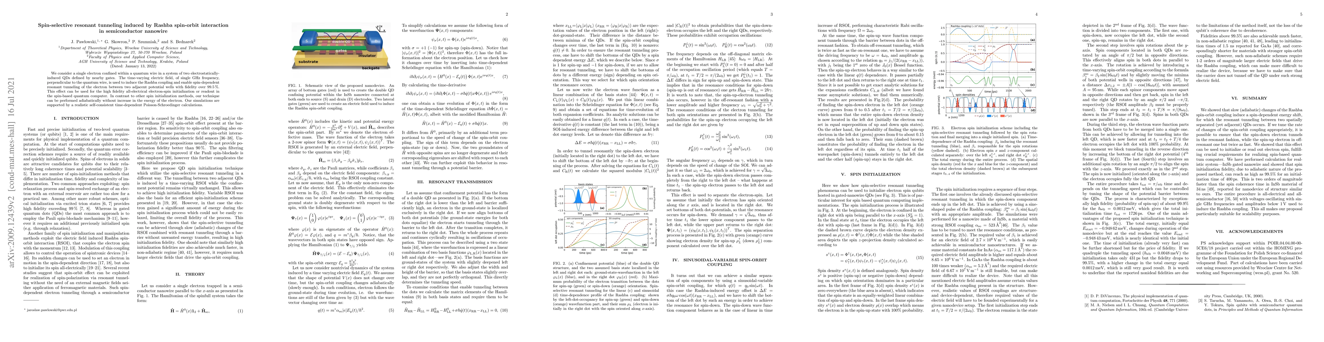 This paper explores spin-selective resonant tunneling in semiconductor nanowires induced by Rashba spin-orbit interaction, achieving high fidelity electron-spin initialization or readout via a GHz electric field. The method allows for adiabatic spin manipulation without increasing the electron's energy, supported by self-consistent time-dependent Poisson-Schroedinger simulations.