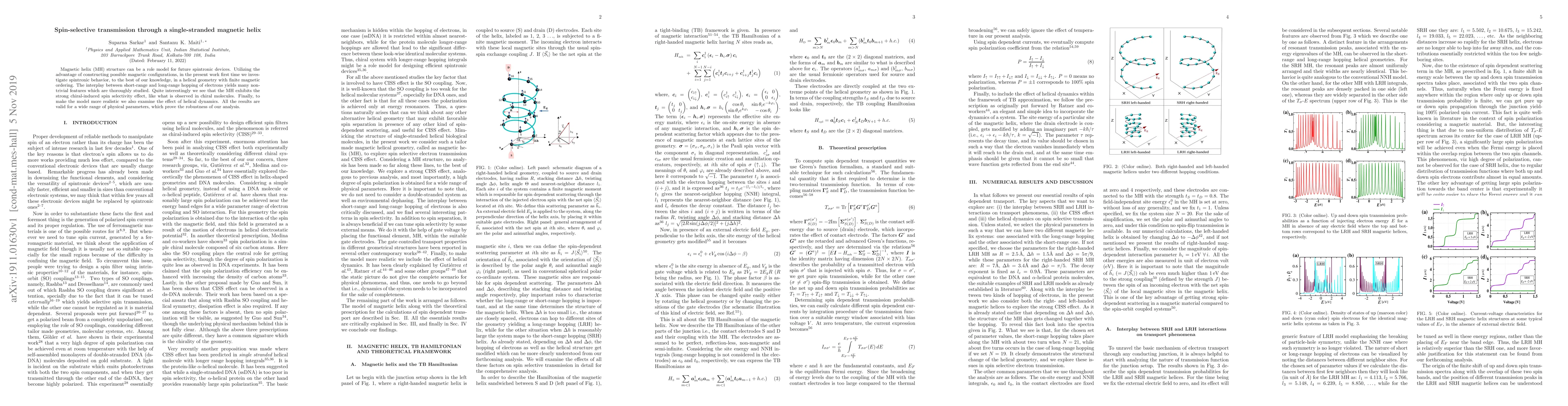 Magnetic helix (MH) structure can be a role model for future spintronic devices. Utilizing the advantage of constructing possible magnetic configurations, in the present work first time we investigate spintronic behavior, to the best of our knowledge, in a helical geometry with finite magnetic ordering. The interplay between short-range and long-range hopping of electrons yields many non-trivial features which are thoroughly studied. Quite interestingly we see that the MH exhibits the strong chiral-induced spin selectivity effect, like what is observed in chiral molecules. Finally, to make the model more realistic we also examine the effect of helical dynamics. All the results are valid for a wide range of physical parameters, which prove the robustness of our analysis.