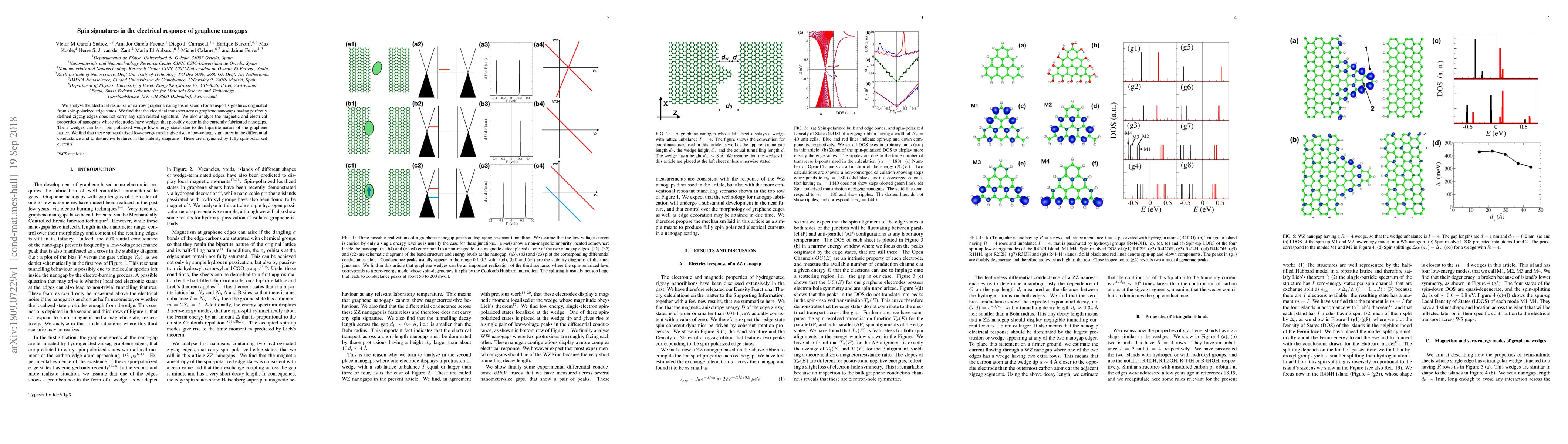 Summary: Researchers investigate graphene nanogaps for spin-polarized transport signatures, finding no spin-related signatures in perfectly defined zigzag edges, but identifying low-voltage conductance signatures and distinctive stability features in nanogaps with wedge-shaped electrodes hosting spin-polarized low-energy states.