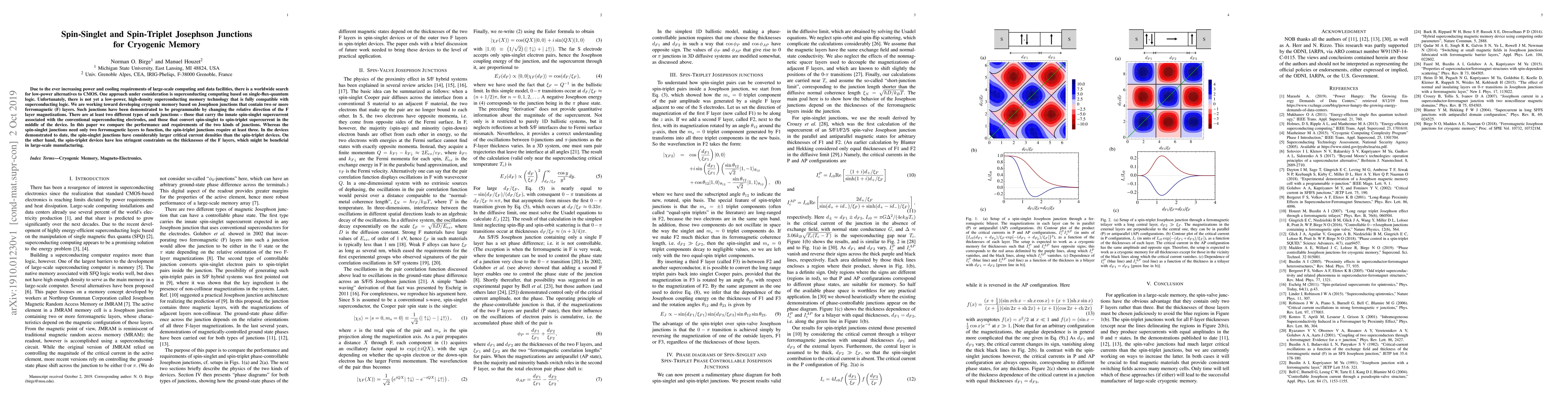 This paper compares cryogenic memory performance based on spin-singlet and spin-triplet Josephson junctions, highlighting that spin-singlet junctions require only two ferromagnetic layers and have higher critical current densities, while spin-triplet junctions necessitate at least three layers and have less stringent layer thickness constraints.