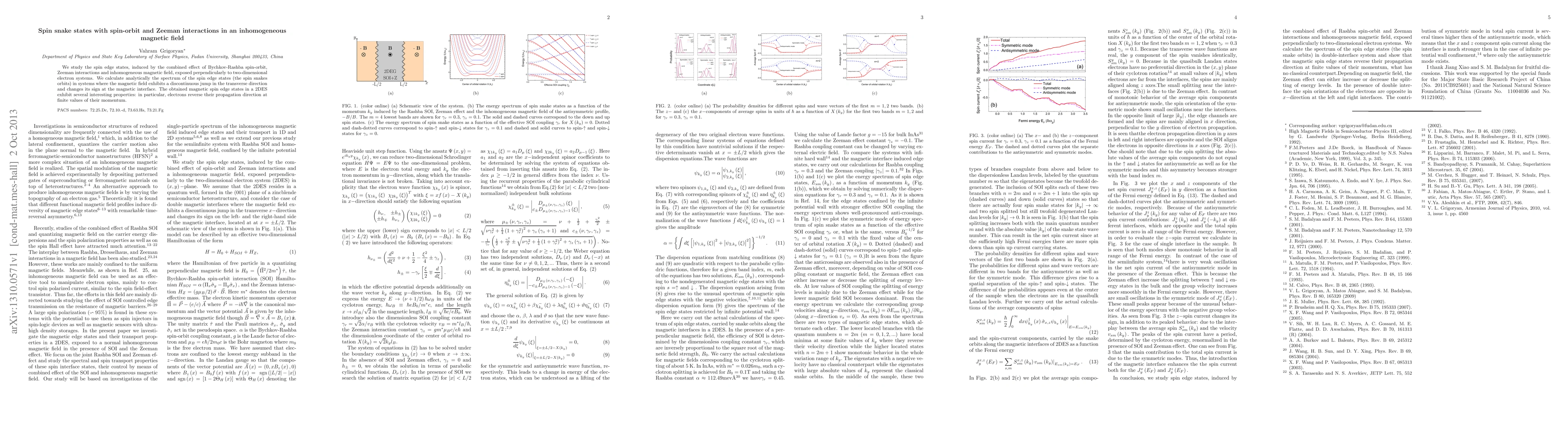 This paper investigates spin edge states in two-dimensional electron systems (2DES) under the influence of Bychkov-Rashba spin-orbit, Zeeman interactions, and an inhomogeneous magnetic field. The study analytically derives the spectrum of these spin snake states, revealing that electrons can reverse their propagation direction at specific momentum values.