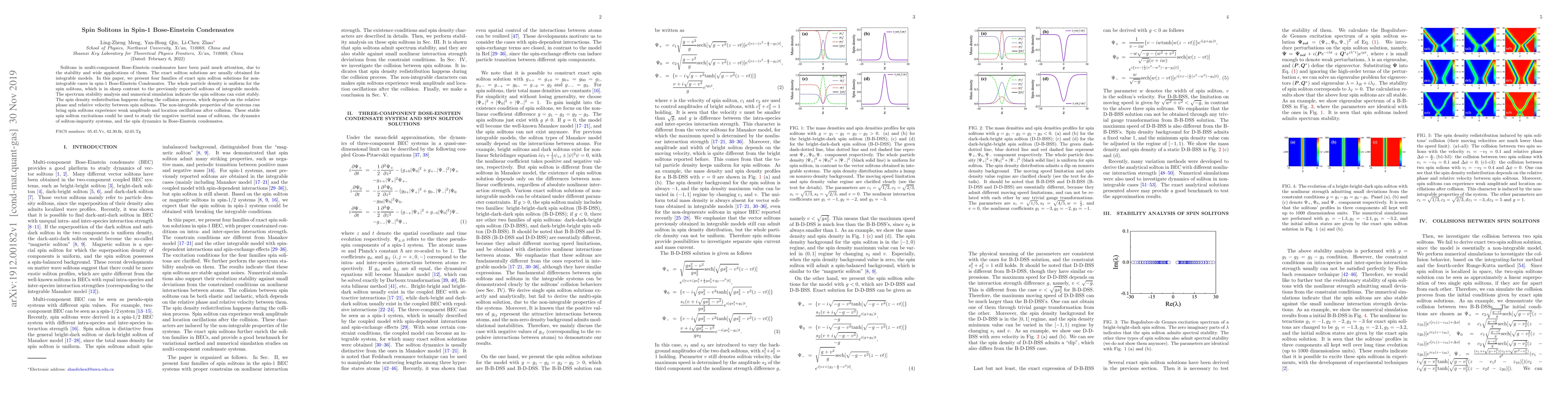 The research presents four families of exact spin soliton solutions for non-integrable models in spin-1 Bose-Einstein condensates, using mathematical derivations and numerical simulations.