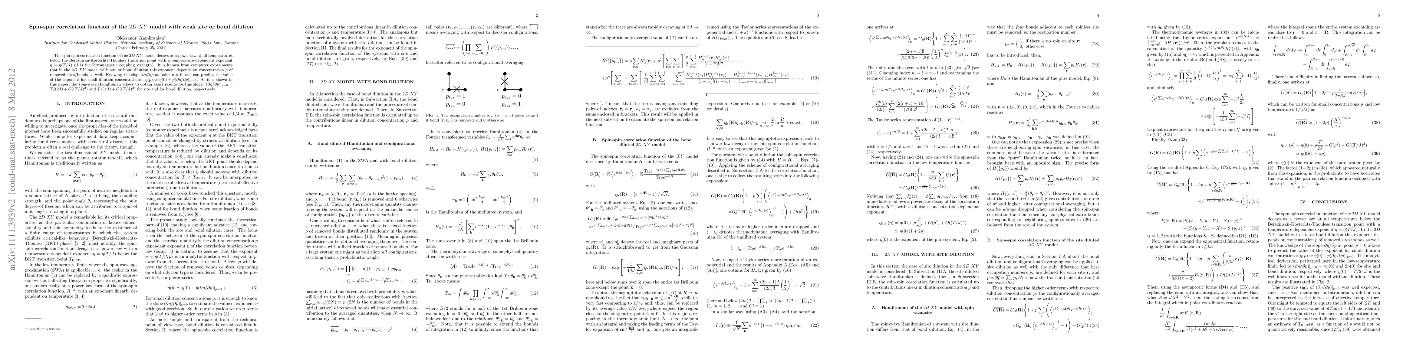 This paper investigates the spin-spin correlation function in the 2D XY model under weak site or bond dilution, finding that the correlation function decays as a power law with a temperature-dependent exponent. The study uses the spin-wave Hamiltonian to derive exact results for the slope of the exponent with respect to dilution concentration, providing a predictive formula for small dilutions.