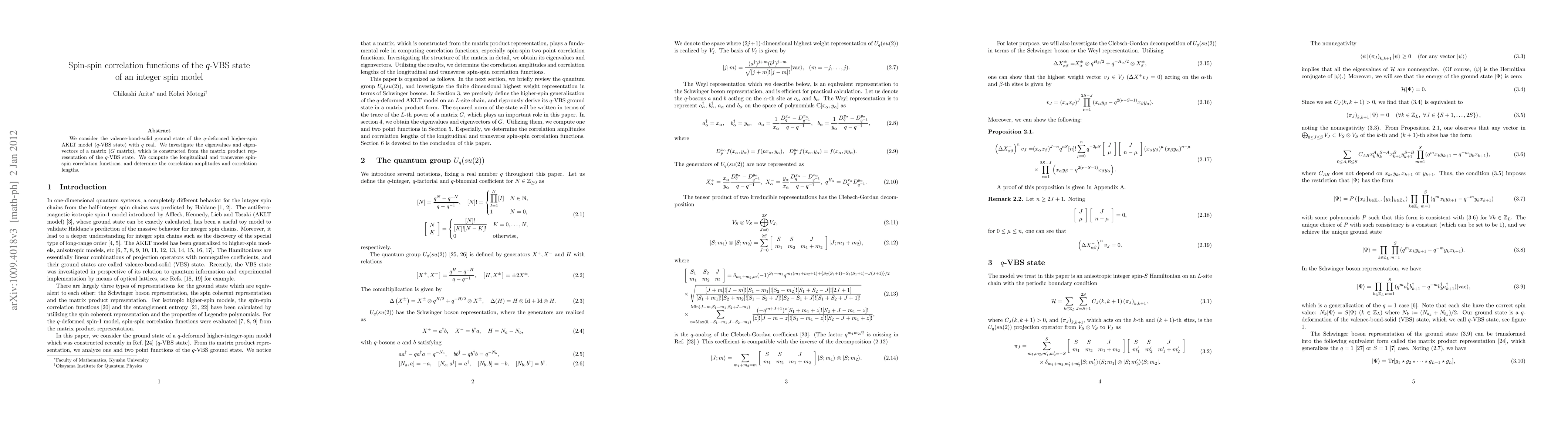 This paper investigates the spin-spin correlation functions in the q-VBS state of a higher-spin AKLT model, computing longitudinal and transverse correlation functions and determining their amplitudes and correlation lengths for real q values. The study uses the G matrix derived from the matrix product representation of the q-VBS state.