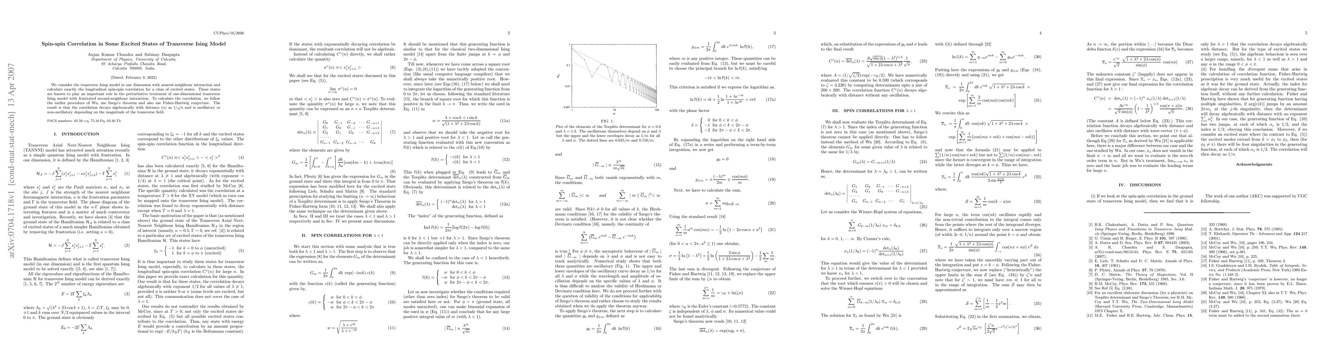 This paper calculates the longitudinal spin-spin correlation in excited states of the one-dimensional transverse Ising model, finding an algebraic decay with distance as $1/\surd n$. The correlation's oscillatory nature depends on the strength of the transverse field.