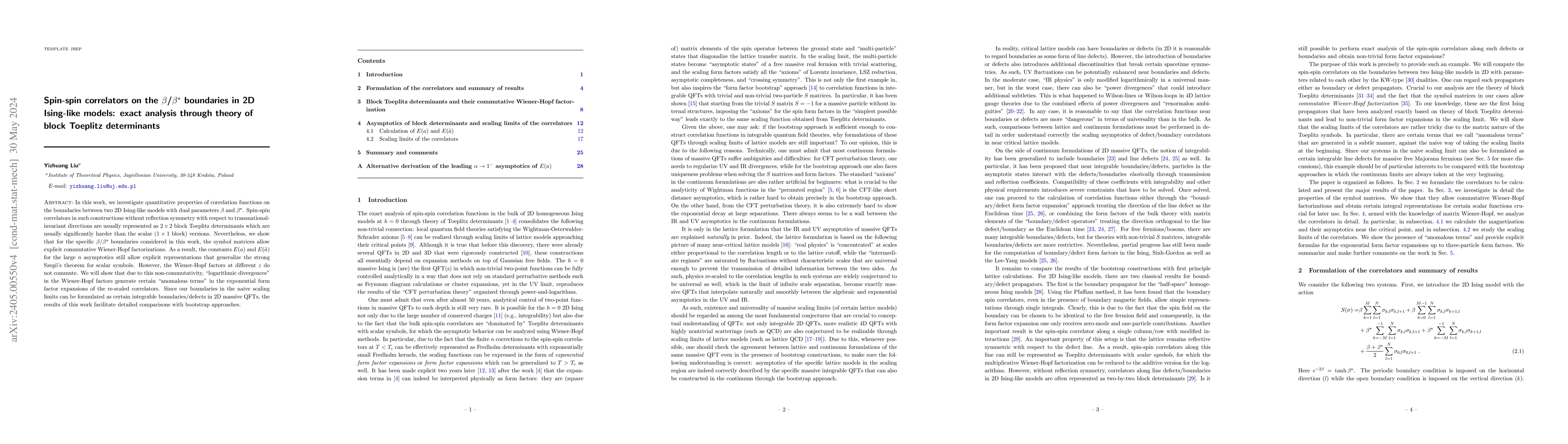 In this work, we investigate quantitative properties of correlation functions on the boundaries between two 2D Ising-like models with dual parameters $\beta$ and $\beta^{\star}$. Spin-spin correlators in such constructions without reflection symmetry with respect to transnational-invariant directions are usually represented as $2\times 2$ block Toeplitz determinants which are usually significantly harder than the scalar ($1\times 1$ block) versions. Nevertheless, we show that for the specific $\beta/\beta^{\star}$ boundaries considered in this work, the symbol matrices allow explicit commutative Wiener-Hopf factorizations. As a result, the constants $E(a)$ and $E(\tilde a)$ for the large $n$ asymptotics still allow explicit representations that generalize the strong Szeg\"o's theorem for scalar symbols. However, the Wiener-Hopf factors at different $z$ do not commute. We will show that due to this non-commutativity, ``logarithmic divergences'' in the Wiener-Hopf factors generate certain ``anomalous terms'' in the exponential form factor expansions of the re-scaled correlators. Since our boundaries in the naive scaling limits can be formulated as certain integrable boundaries/defects in 2D massive QFTs, the results of this work facilitate detailed comparisons with bootstrap approaches.