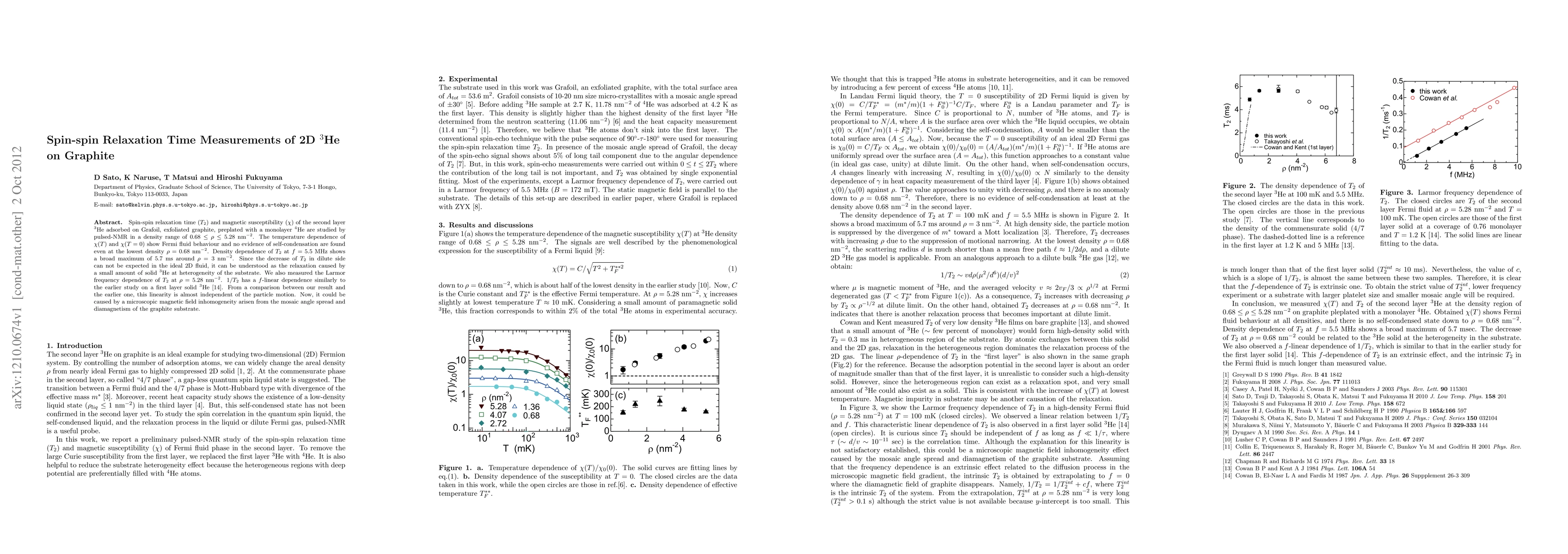This study investigates the spin-spin relaxation time ($T_2$) and magnetic susceptibility of $^3$He in the second layer adsorbed on graphite using pulsed-NMR. The results show a broad maximum in $T_2$ at a density of 3 nm$^{-2}$, suggesting relaxation due to substrate heterogeneity rather than ideal 2D fluid behavior. The linearity of $1/T_2$ with frequency indicates a microscopic magnetic field inhomogeneity likely caused by substrate diamagnetism.