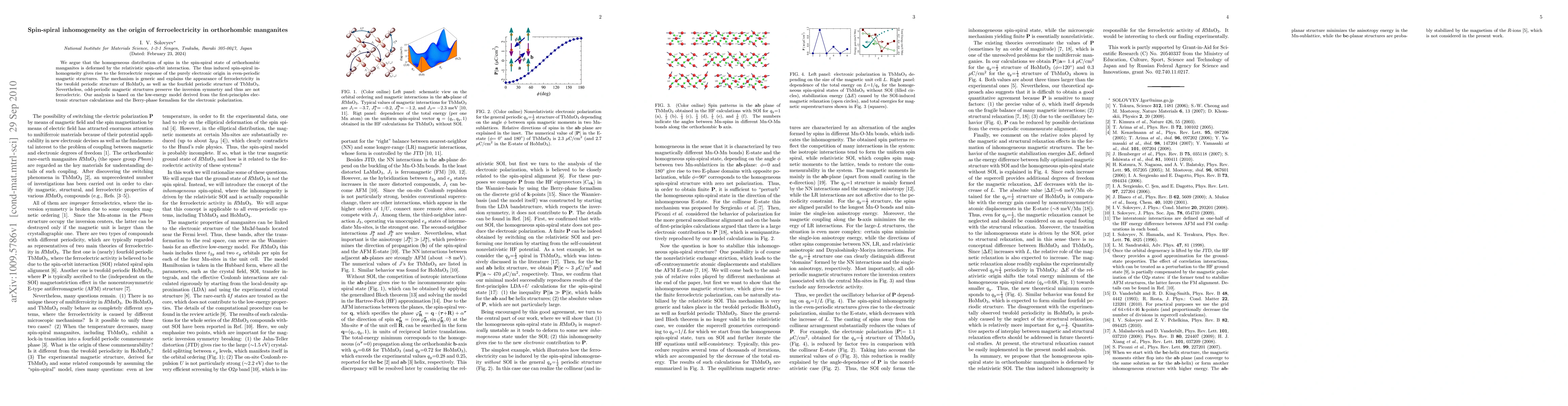 This paper proposes that spin-spiral inhomogeneity, induced by relativistic spin-orbit interaction, is the origin of ferroelectricity in orthorhombic manganites, explaining the phenomenon in even-periodic magnetic structures like HoMnO3 and TbMnO3. Odd-periodic structures lack ferroelectricity due to preserved inversion symmetry.