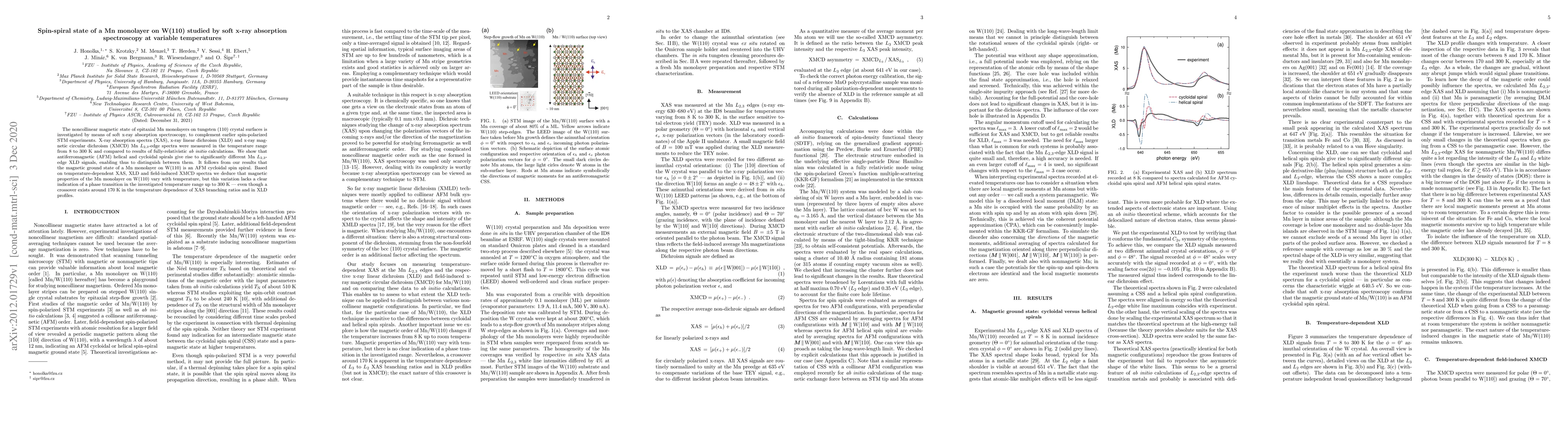 The noncollinear magnetic state of epitaxial Mn monolayers on tungsten (110) crystal surfaces is investigated by means of soft x-ray absorption spectroscopy, to complement earlier spin-polarized STM experiments. X-ray absorption spectra (XAS), x-ray linear dichroism (XLD) and x-ray magnetic circular dichroism (XMCD) Mn L23-edge spectra were measured in the temperature range from 8 to 300 K and compared to results of fully-relativistic ab initio calculations. We show that antiferromagnetic (AFM) helical and cycloidal spirals give rise to significantly different Mn L23-edge XLD signals, enabling thus to distinguish between them. It follows from our results that the magnetic ground state of a Mn monolayer on W(110) is an AFM cycloidal spin spiral. Based on temperature-dependent XAS, XLD and field-induced XMCD spectra we deduce that magnetic properties of the Mn monolayer on W(110) vary with temperature, but this variation lacks a clear indication of a phase transition in the investigated temperature range up to 300 K - even though a crossover exists around 170 K in the temperature dependence of XAS branching ratios and in XLD profiles.