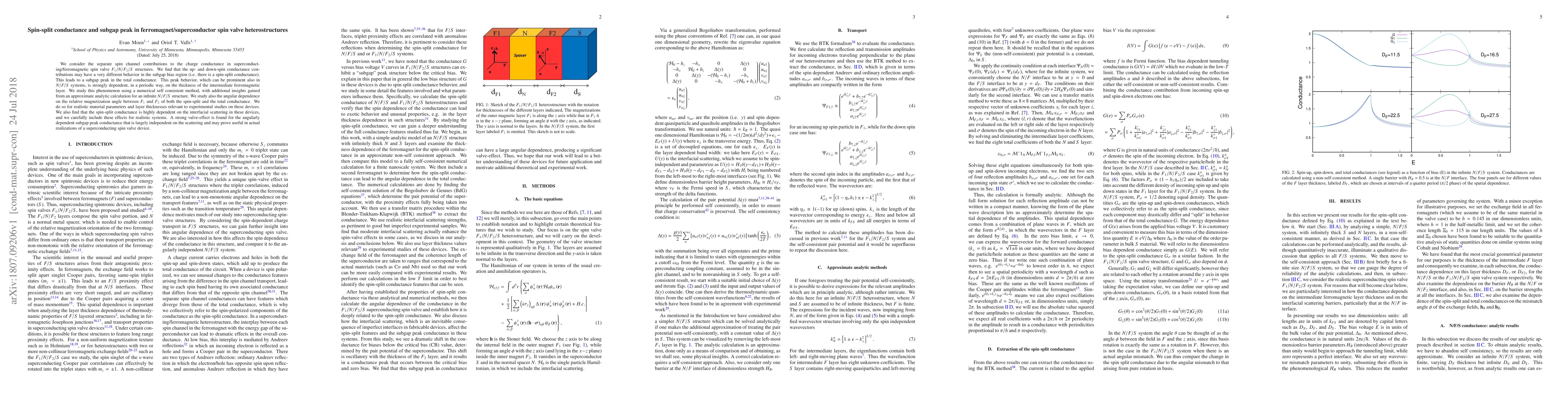 Researchers studied spin-split conductance in ferromagnet/superconductor spin valve heterostructures and found a subgap peak that depends on the thickness of the intermediate layer and is influenced by interfacial scattering.