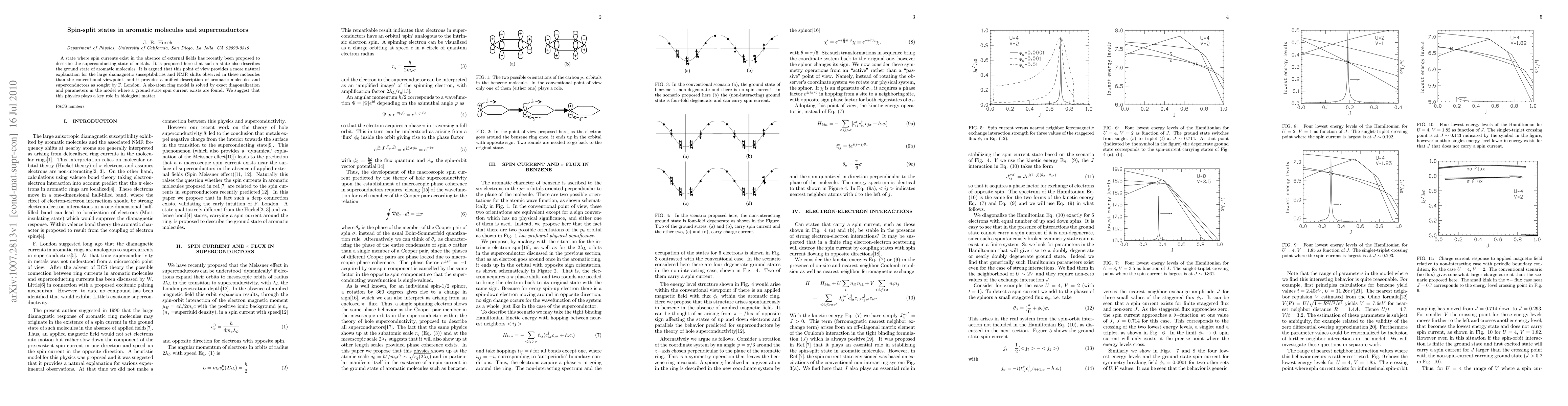 This paper proposes that spin-split states, originally described for superconductors, also characterize the ground state of aromatic molecules, offering a unified explanation for their observed diamagnetic susceptibilities and NMR shifts. A six-atom ring model demonstrates the existence of a ground state spin current, suggesting this phenomenon is crucial in biological matter.