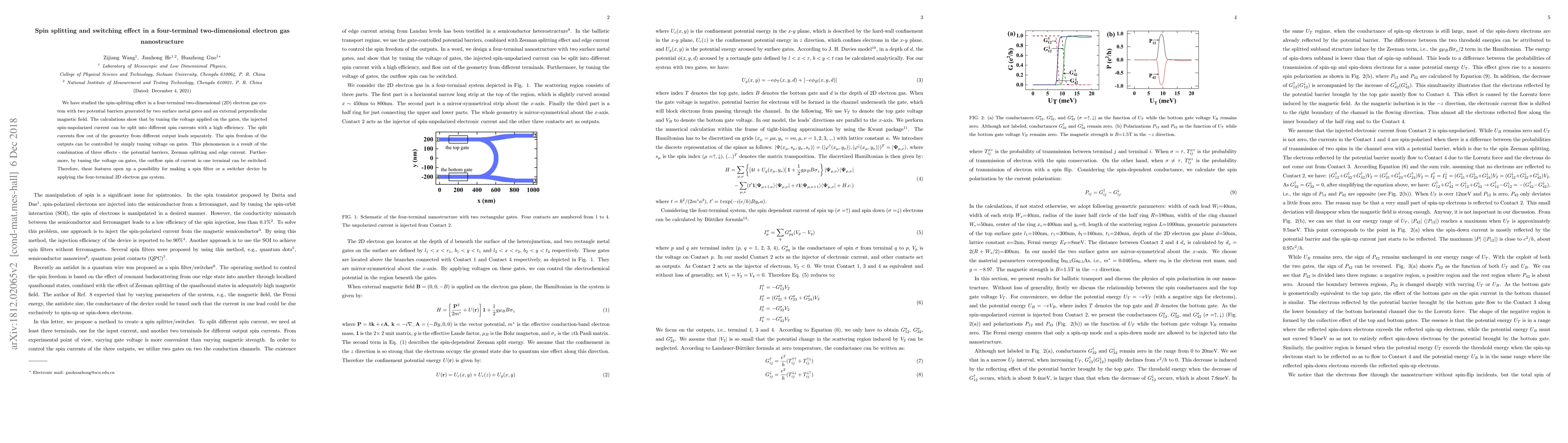 This paper investigates a four-terminal two-dimensional electron gas nanostructure where spin-splitting and switching effects are achieved by tuning gate voltages. The study reveals high efficiency in splitting spin-unpolarized current into separate spin currents, controlled by the applied voltage, and demonstrates potential for spin filter or switcher devices.