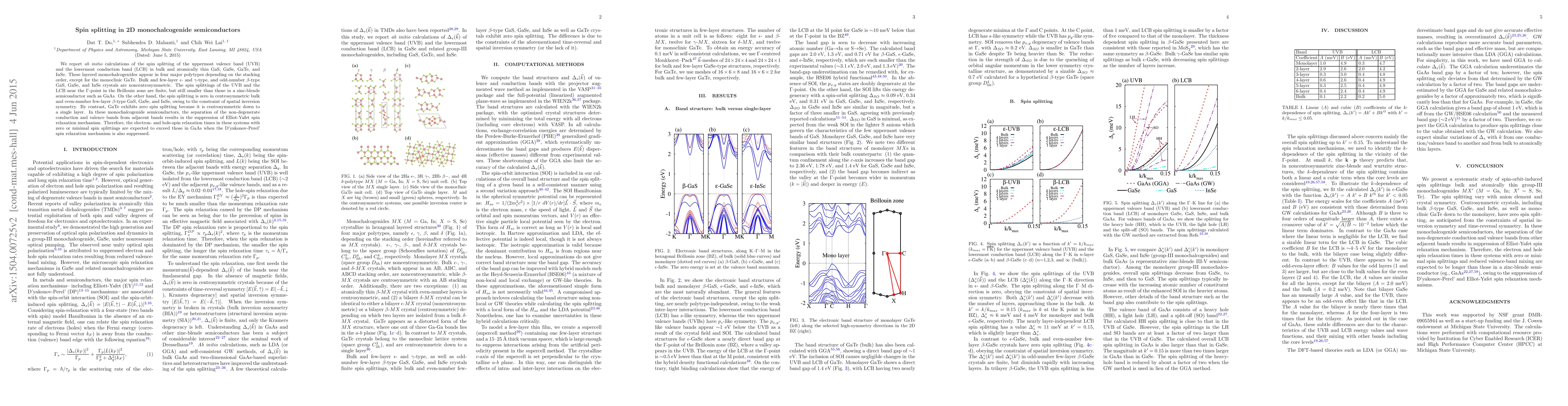 This study investigates spin splitting in the valence and conduction bands of several 2D monochalcogenide semiconductors using ab initio calculations. It finds that spin splitting is present in noncentrosymmetric polytypes but absent in centrosymmetric ones, leading to potentially longer spin relaxation times compared to zinc-blende semiconductors like GaAs.