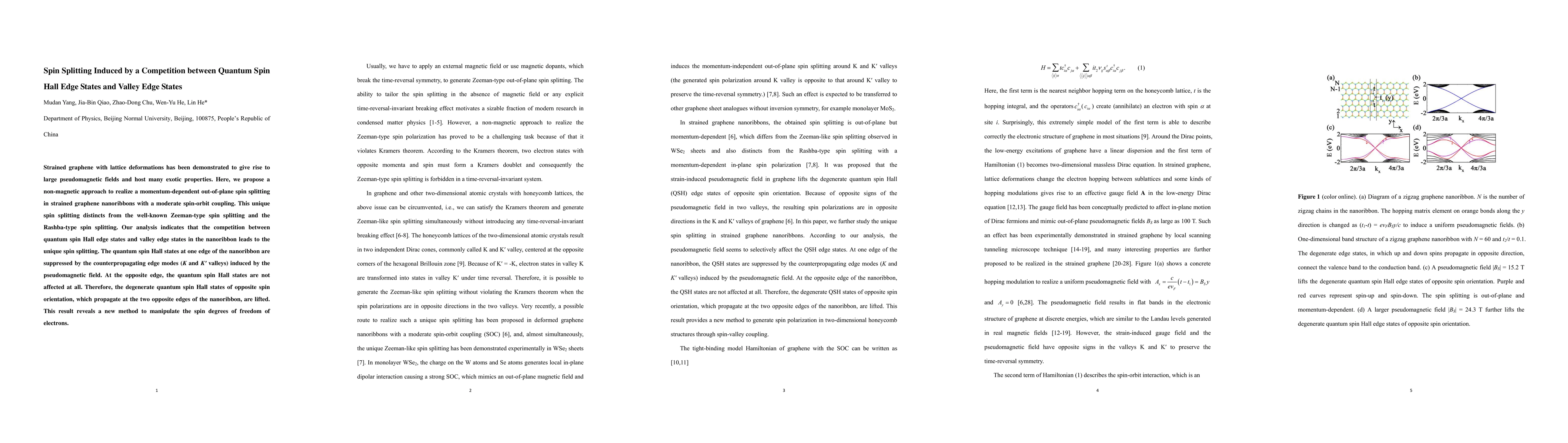 This study proposes a non-magnetic method for achieving momentum-dependent out-of-plane spin splitting in strained graphene nanoribbons, driven by competition between quantum spin Hall edge states and valley edge states. The unique spin splitting results from the suppression of quantum spin Hall states at one edge due to pseudomagnetic fields.