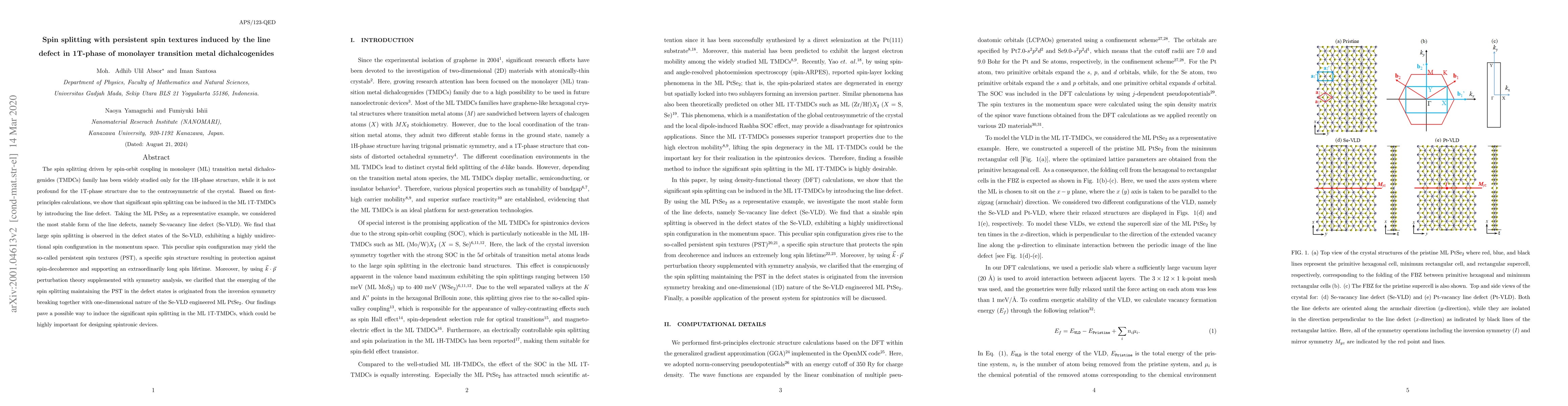 This paper demonstrates that introducing a line defect, specifically a Se-vacancy line defect, in the 1T-phase monolayer PtSe2 induces significant spin splitting due to inversion symmetry breaking, resulting in persistent spin textures and long spin lifetimes. This discovery could advance the design of spintronic devices in transition metal dichalcogenides.