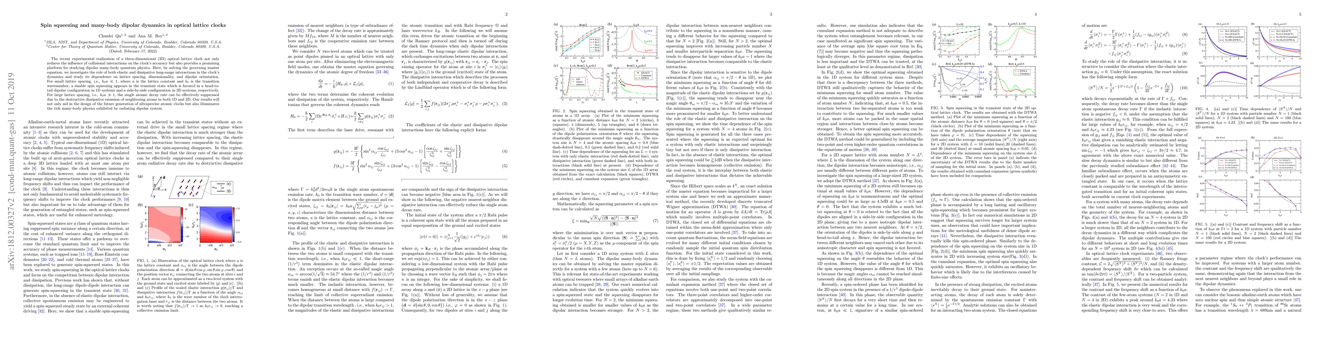 This paper investigates the dynamics of a 3D optical lattice clock, focusing on spin squeezing and many-body dipolar interactions. It finds that small lattice spacing favors spin squeezing in specific configurations, while large spacing enhances atomic decay suppression due to collective emission, providing insights for future atomic clock designs and dipolar quantum physics.