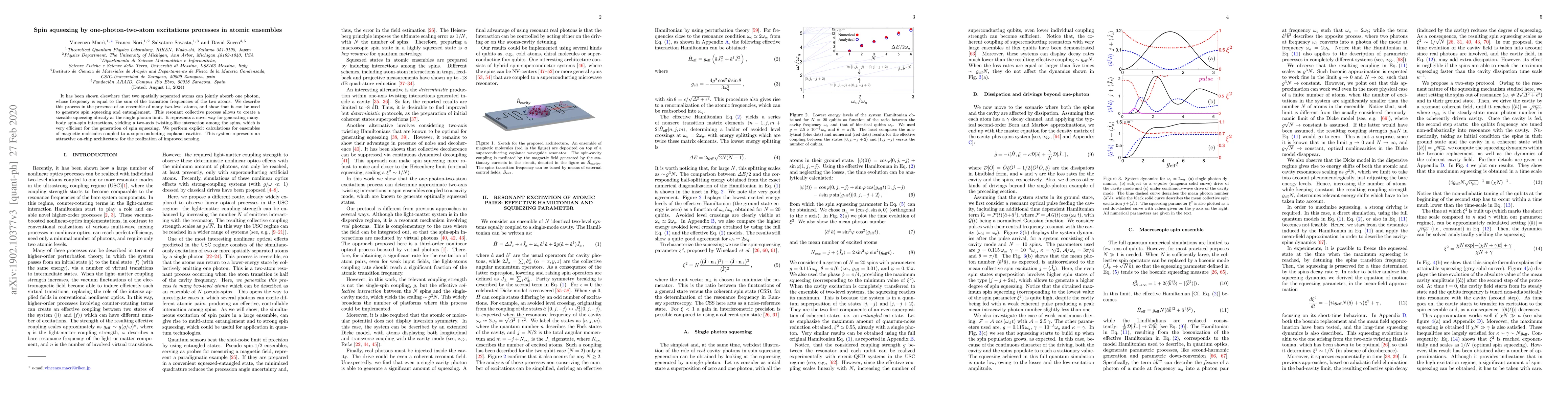 It has been shown elsewhere that two spatially separated atoms can jointly absorb one photon, whose frequency is equal to the sum of the transition frequencies of the two atoms. We describe this process in the presence of an ensemble of many two-level atoms, and show that it can be used to generate spin squeezing and entanglement. This resonant collective process allows to create a sizeable squeezing already at the single-photon limit. It represents a novel way for generating manybody spin-spin interactions, yielding a two-axis twisting-like interaction among the spins, which is very effcient for the generation of spin squeezing. We perform explicit calculations for ensembles of magnetic molecules coupled to a superconducting coplanar cavities. This system represents an attractive on-chip architecture for the realization of improved sensing.