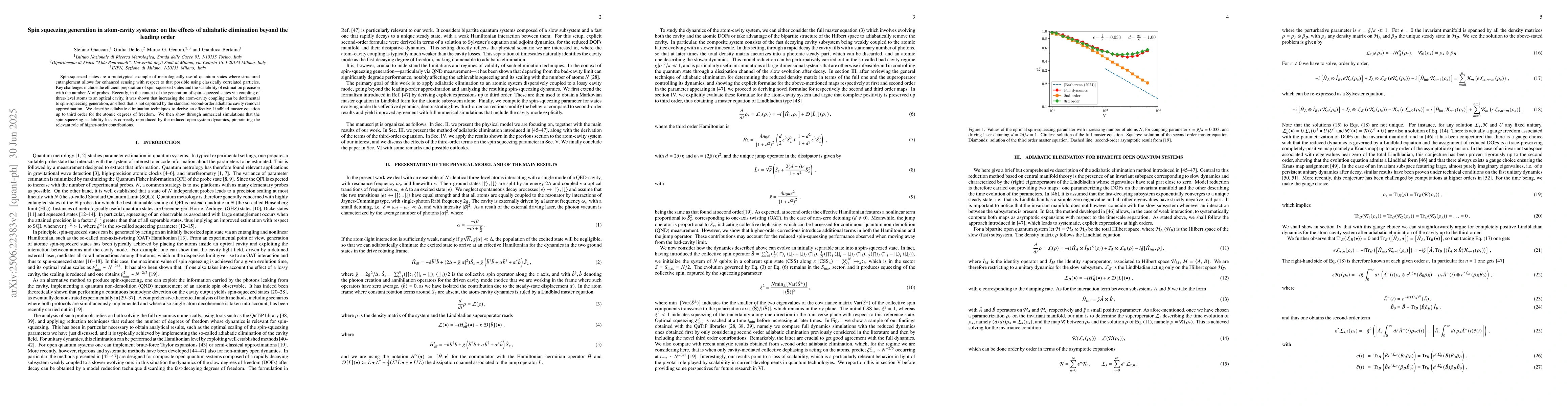 Spin-squeezed states are a prototypical example of metrologically useful quantum states where structured entanglement allows for enhanced sensing with respect to that possible using classically correlated particles. Key challenges include the efficient preparation of spin-squeezed states and the scalability of estimation precision with the number $N$ of probes. Recently, in the context of the generation of spin-squeezed states via coupling of three-level atoms to an optical cavity, it was shown that increasing the atom-cavity coupling can be detrimental to spin-squeezing generation, an effect that is not captured by the standard second-order adiabatic cavity removal approximation. We describe adiabatic elimination techniques to derive an effective Lindblad master equation up to third order for the atomic degrees of freedom. We then show through numerical simulations that the spin-squeezing scalability loss is correctly reproduced by the reduced open system dynamics, pinpointing the relevant role of higher-order contributions.