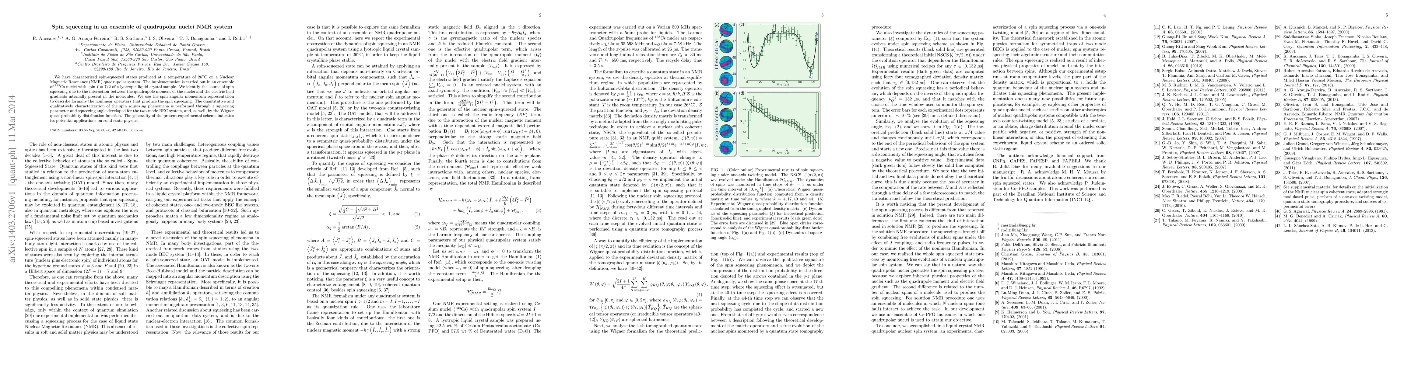This paper characterizes spin-squeezed states in a $^{133}$Cs NMR quadrupolar system at $26^\circ{\mathrm C}$, attributing the squeezing to interactions between nuclear quadrupole moments and internal electric field gradients. The study employs advanced mathematical tools to quantify and describe the phenomenon, suggesting potential applications in solid-state physics.