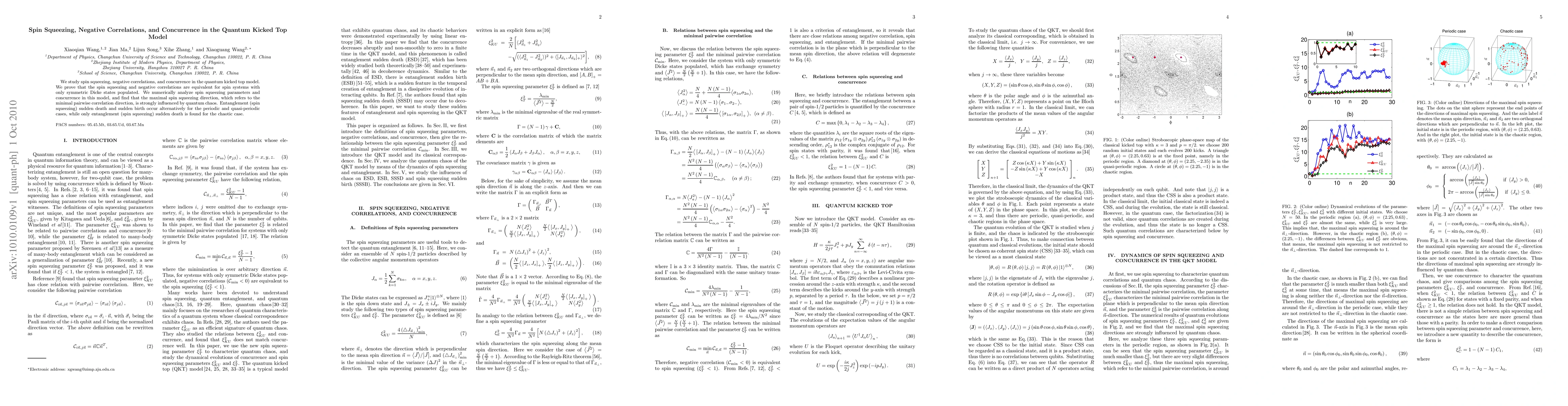 This paper investigates spin squeezing, negative correlations, and concurrence in the quantum kicked top model, demonstrating that spin squeezing and negative correlations are equivalent for symmetric Dicke states. It finds that quantum chaos significantly influences the maximal spin squeezing direction and observes alternating entanglement sudden death and birth in periodic and quasi-periodic cases, contrasting with only sudden death in chaotic scenarios.