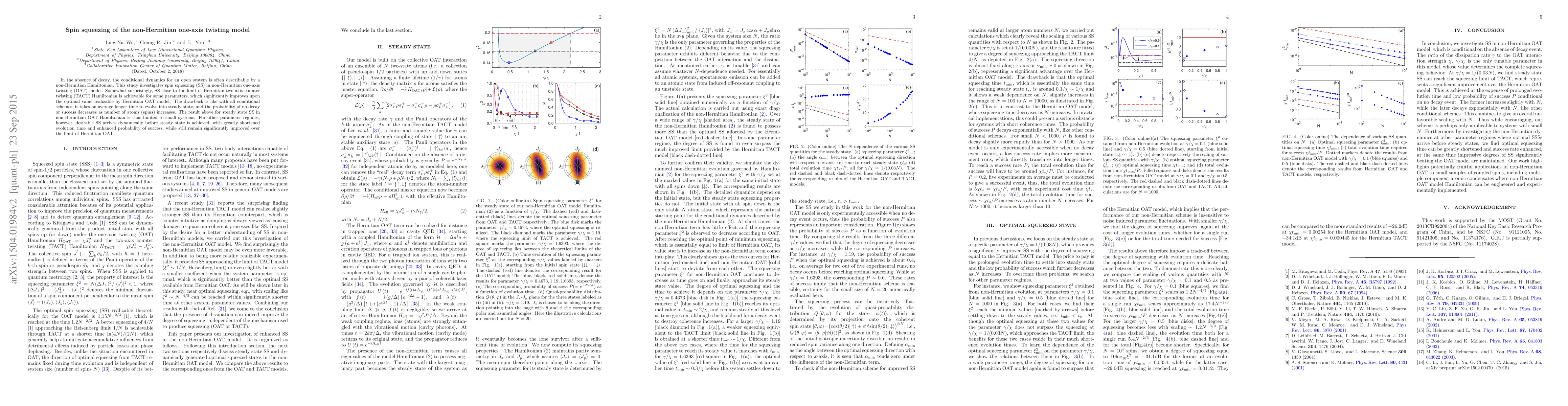 In the absence of decay, the conditional dynamics for an opensystem is often describable by a non-Hermitian Hamiltonian. This study investigates spin squeezing (SS) in non-Hermitian one-axis twisting (OAT) model. Somewhat surprisingly, SS close to the limit of Hermitian two-axis counter twisting (TACT) Hamiltonian is achievable for some parameters, which significantly improves upon the optimal value realizable by Hermitian OAT model. The drawback is like with all conditional schemes, it takes on average longer time to evolve into steady state, and the probability of no decay or success decreases as number of atoms (spins) increases. The result above for steady state SS in non-Hermitian OAT Hamiltonian is thus limited to small systems. For other parameter regimes, however, desirable SS arrives dynamically before steady state is achieved, with greatly shortened evolution time and enhanced probability of success, while still remain significantly improved over the limit of Hermitian OAT.