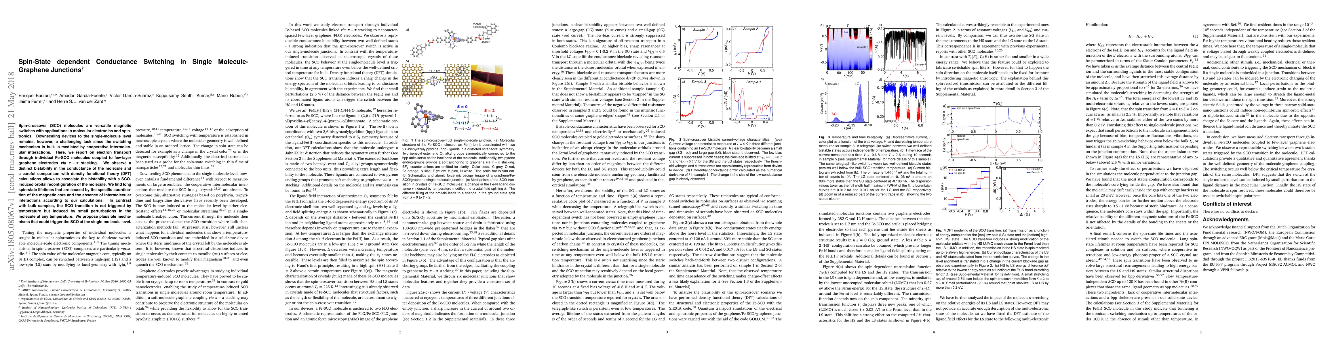 This paper investigates electron transport through single Fe-spin-crossover molecules connected to graphene, revealing distinct conductance bistability linked to spin-crossover-induced orbital reconfiguration. Unlike bulk systems, the spin-crossover transition in single molecules is triggered by small perturbations rather than temperature.